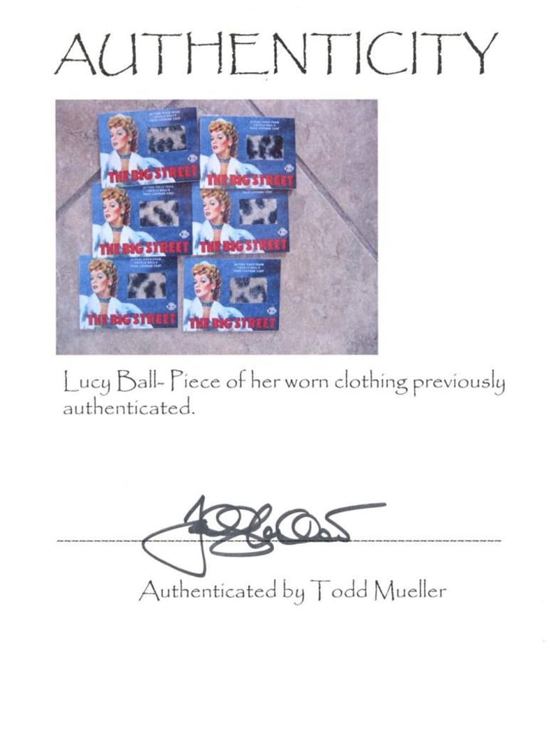 LUCILLE BALL REMANT CARD Lucille Ball Piece Of Worn Clothing On Am 8 X 11 Remant Card. The Item Is Accompanied By A Certificate Of Authenticity. Condition: Good - Refer To Images 585039+25