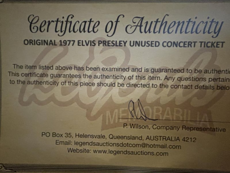 An Original 1977 Elvis Presley Concert Ticket For September 26, 1977. The Item Is Accompanied By A Certificate Of Authenticity.
