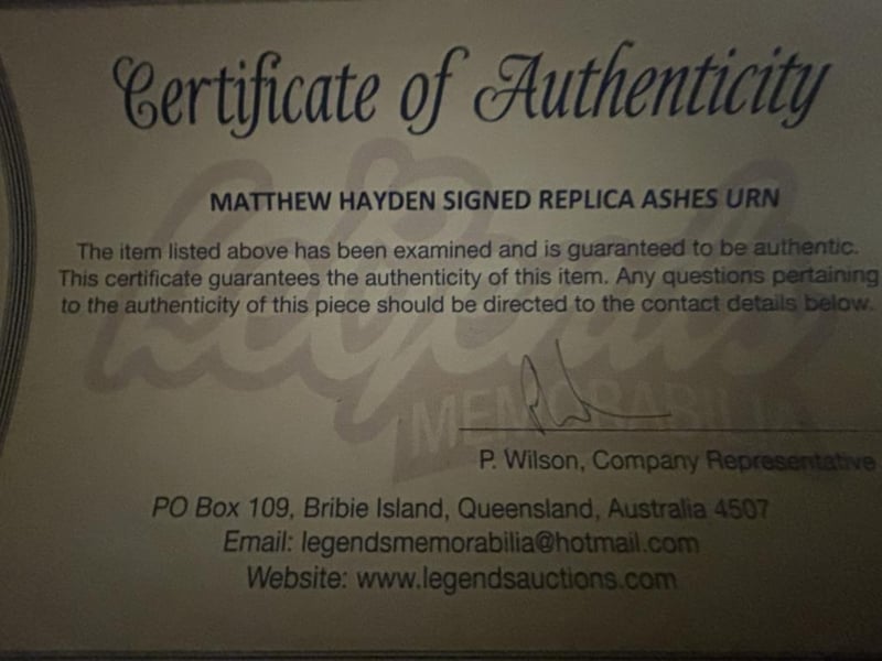 MATTHEW HAYDEN SIGNED ASHES URNMatthew Hayden Personally Signed Replica Ashes Urnthe Item Is Accompanied By A Certificate Of Authenticity.Condition: Good - Refer To Images585039+45