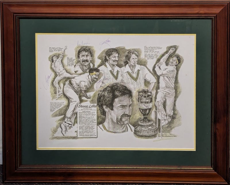 DENNIS LILLEE SIGNED CRICKET MEMORABILIAItem Size: Height: 66cm, Width: 80cmFeatures Dennis Lillee Signed Centre Signature And Three Signatures Signed In PlateCondition: Good - Refer To Images585034+2