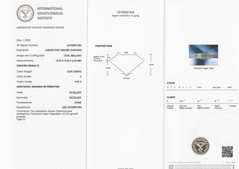 5.09 Oval Shaped Diamond E/Vvs2 Igi Certificate # Lg 703501354 Laser Inscribed : Labgrown Igi Lg 703501354 Polish : Excellent Symmetry : Excellent Flourescence : None Type : Cvd