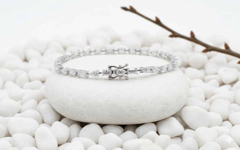 14K WHITE GOLD LAB GROWN DIAMOND TENNIS BRACELET, PEAR OVAL AND BUGUETTE CUT 4.26CT D - E VVS+