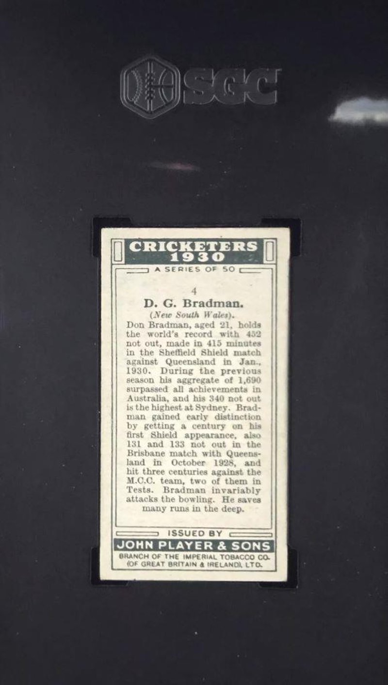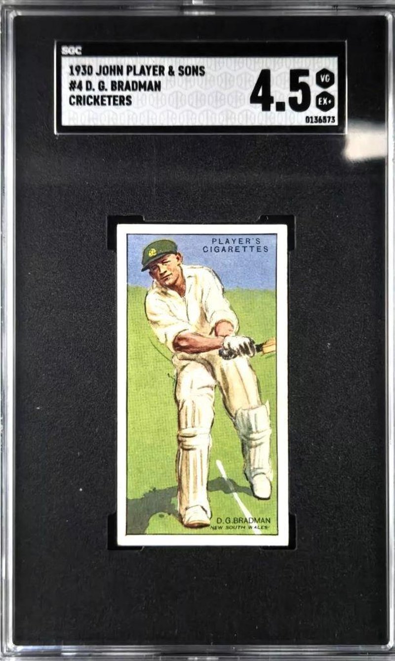 1930 JOHN PLAYER & SONS CRICKETERS #4 SIR DONALD BRADMAN – SGC 4.5 VG-EXPresented Here Is An Outstanding Example Of The 1930 John Player & Sons Cricketers #4, Featuring None Other Than Sir Donald Bradman, Widely Regarded As The Finest Batsman In The History Of Cricket. Graded Sgc 4.5 (Very Good To Excellent), This Card Is Part Of The Celebrated Player'S Cigarettes Series, Distributed In Tobacco Packets During The Golden Era Of British And Australian Cricket. Issued In The Same Year Bradman Took The Ashes By Storm With His 974-Run Tour Of England, This Card Holds A Seminal Place In Both Cricketing And Collecting History.Size: 0Condition: Good - Refer To Images584998+3