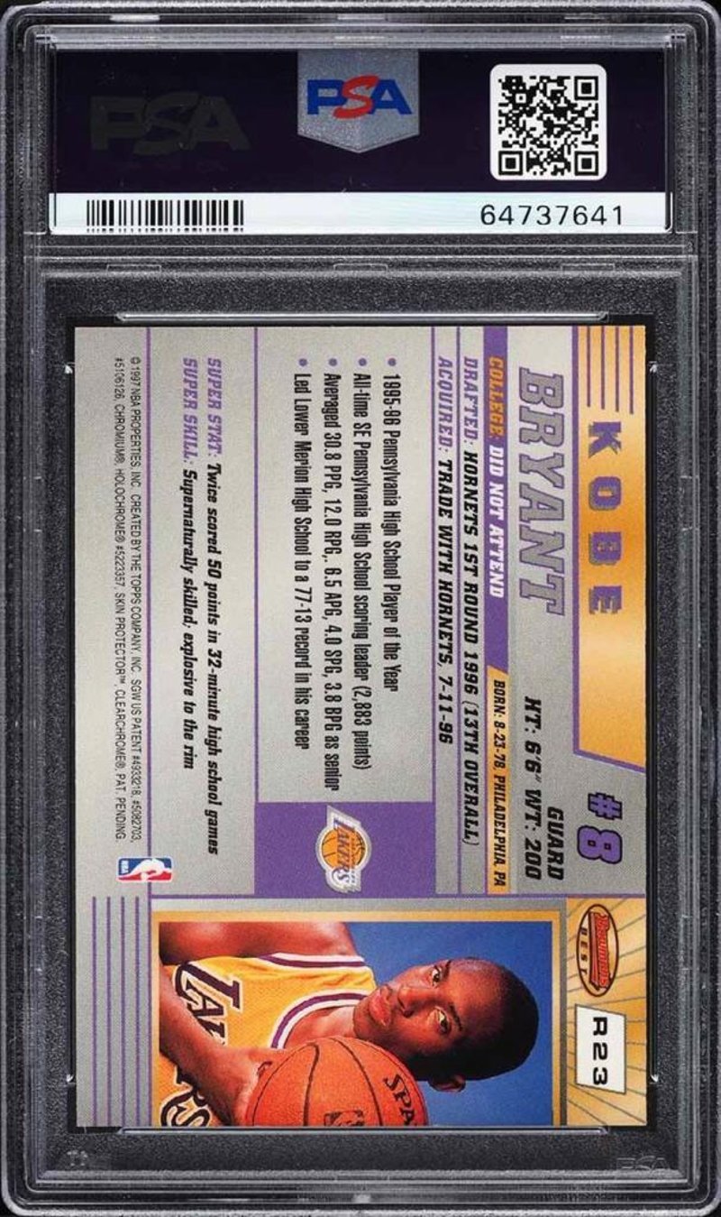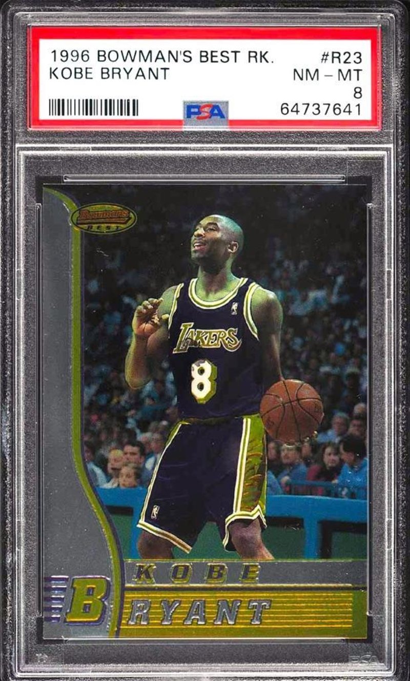 1996 BOWMAN'S BEST KOBE BRYANT ROOKIE CARD #R23 – PSA 8 NM-MTOffered Here Is The 1996 Bowman'S Best Kobe Bryant Rookie Card #R23, Graded Psa 8 Near Mint–Mint, Representing One Of The Most Iconic Rookie-Year Releases Of The Black Mamba. Issued During Kobe’S Entry Into The Nba Straight From High School, This Card Is Part Of The Revered Bowman'S Best Set—A Chromium-Stock Series Known For Its Sharp Print Quality, Modern Design, And Rich Rookie Checklist. The Card Features A Young Bryant Donning His Early Los Angeles Lakers Jersey, Captured In A Dynamic In-Game Pose. The Metallic Finish, Holographic Detailing, And Refractor-Style Sheen Helped Define Mid-1990S Premium Card Design, Placing This Release Firmly In The Heart Of The Hobby’S Transition To Modern Aesthetics.Size: 0Condition: Good - Refer To Images584998+22