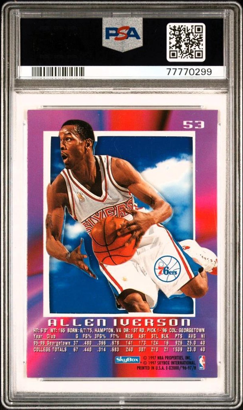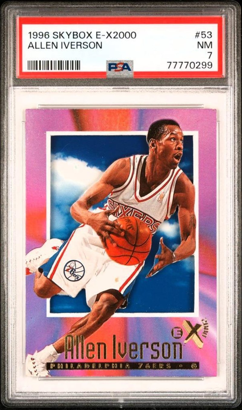 1996 SKYBOX E-X2000 ALLEN IVERSON ROOKIE CARD #53 – PSA 7This Listing Features The Celebrated 1996 Skybox E-X2000 Allen Iverson Rookie Card #53, Graded Psa 7 (Near Mint). As Part Of One Of The Most Artistically Ambitious Sets Of The 1990S, The E-X2000 Release Delivered Striking Design Innovation, Combining Futuristic Visuals With A Transparent Acetate Window. Iverson'S Rookie Card From This Series Captures The Energy And Attitude Of A Generational Point Guard Making His Nba Debut.Size: 0Condition: Good - Refer To Images584998+7