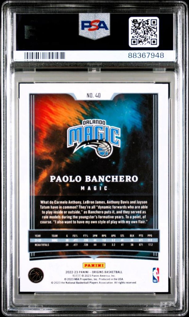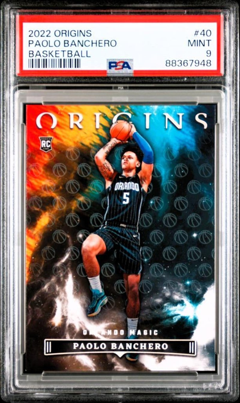 2022–23 PANINI ORIGINS PAOLO BANCHERO ROOKIE CARD #40 – PSA 9Presented Is The 2022–23 Panini Origins Basketball Rookie Card #40 Of Paolo Banchero, Graded Psa 9 (Mint). As The No.1 Overall Pick In The 2022 Nba Draft And The Eventual Rookie Of The Year, Banchero’S Introduction To The Collecting World Has Been Met With Intense Anticipation. This Origins Issue Captures The Rising Orlando Magic Star In One Of His Most Artistically Designed Early Cards.Size: 0Condition: Good - Refer To Images584998+9