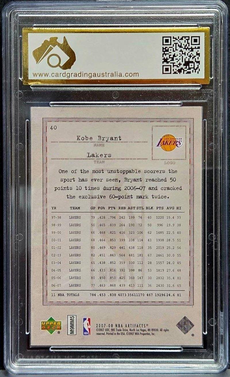 2007 UPPER DECK ARTIFACTS KOBE BRYANT #40 – CGA 9.5 GEM/MTOffered Here Is The 2007 Upper Deck Artifacts Kobe Bryant #40, Graded Cga 9.5. Released During A Defining Period Of Bryant’S Career, This Card Reflects His Established Status As One Of The League’S Leading Performers. By 2007, Bryant Had Secured His Position As A Central Figure For The Los Angeles Lakers, Delivering Consistent Elite-Level Play And Preparing For The Championship Run That Would Follow Shortly Thereafter. The Artifacts Series Was Positioned As A Higher-Tier Product Within Upper Deck’S Portfolio, Making This Example A Noteworthy Representation Of Bryant During A Mature And Highly Productive Stage Of His Career.Size: 0Condition: Good - Refer To Images584998+30