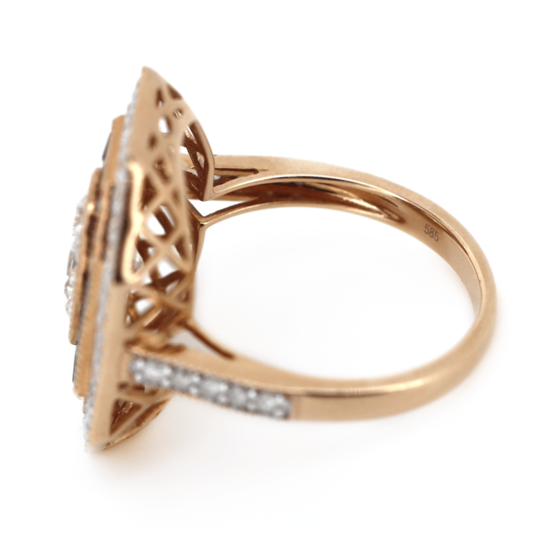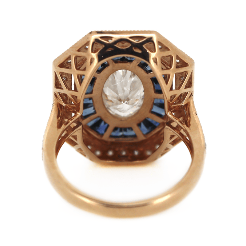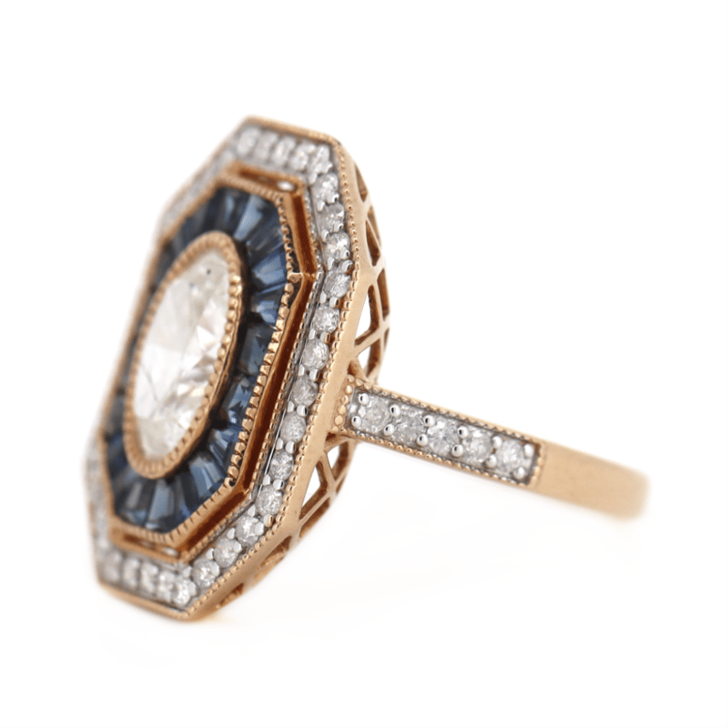14K ROSE GOLD, BLUE SAPPHIRE AND DIAMOND, ART DECO INSPIRED COCKTAIL RING.