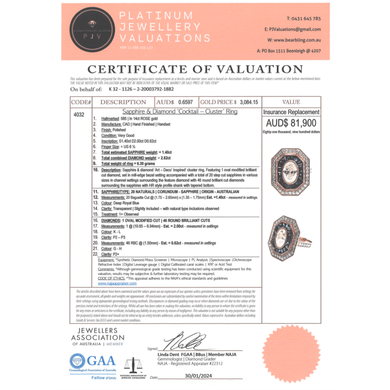 This Insurance Valuation has been provided by a registered Jewellery Valuer and is intended for insurance purposes only. The valuation amount has no bearing on the auction value of the item. Any questions regarding the valuation should be directed to the issuing Valuer (refer to contact details on the certificate) as Lloyds have no association or relationship with the Valuer or the valuation amount contained within the valuation.