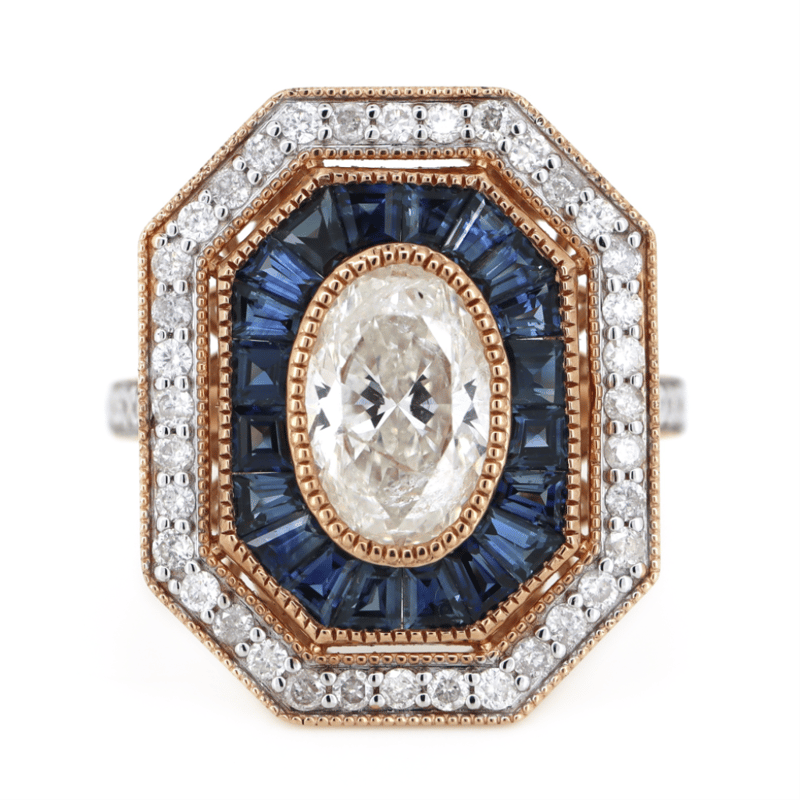 The Centre Features, One Oval Modified Cut, Diamond (2.00Ct, K-L Colour, P2-P3 Clarity), Bezel Set With Mill Grain Detail. Surrounding The Centre In The Inner Halo Are, 20 Baguette Cut, Deep Royal Blue, Sapphires (1.40Ct Tsw, Slightly Included, Enhanced), Channel Set. Surrounding The Design In The Outer Halo And Decorating The Band Are, 46 Round Brilliant Cut, Diamonds (0.62Ct Tdw, G-H Colour, P2+ Clarity), Bead Set With Mill Grain Detail. Ring Size M 1/2.