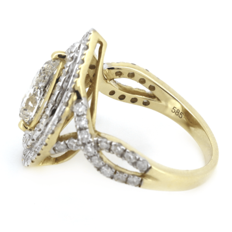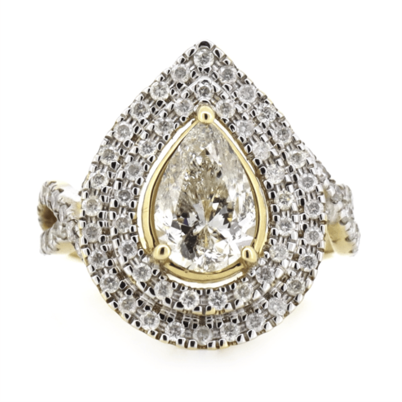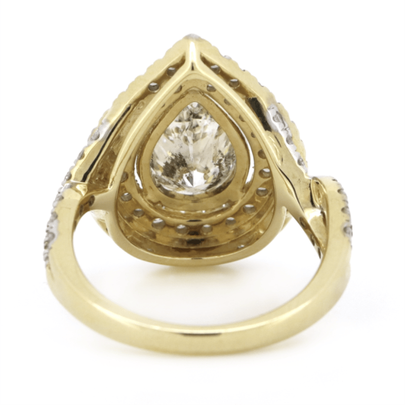 The Centre Features, One Pear Modified Brilliant Cut, Diamond (1.71Ct, M-N Colour, P2 Clarity), 3 Claw Set. Surrounding The Centre In A Double Halo And Decorating The Split Band Are, 78 Round Brilliant Cut, Diamonds (0.88Ct Tdw, H-K Colour, P1 Clarity), Bead Set. Ring Size M 1/2.