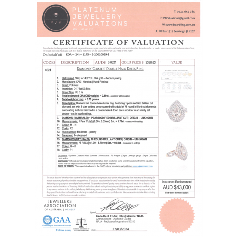 This Insurance Valuation has been provided by a registered Jewellery Valuer and is intended for insurance purposes only. The valuation amount has no bearing on the auction value of the item. Any questions regarding the valuation should be directed to the issuing Valuer (refer to contact details on the certificate) as Lloyds have no association or relationship with the Valuer or the valuation amount contained within the valuation.