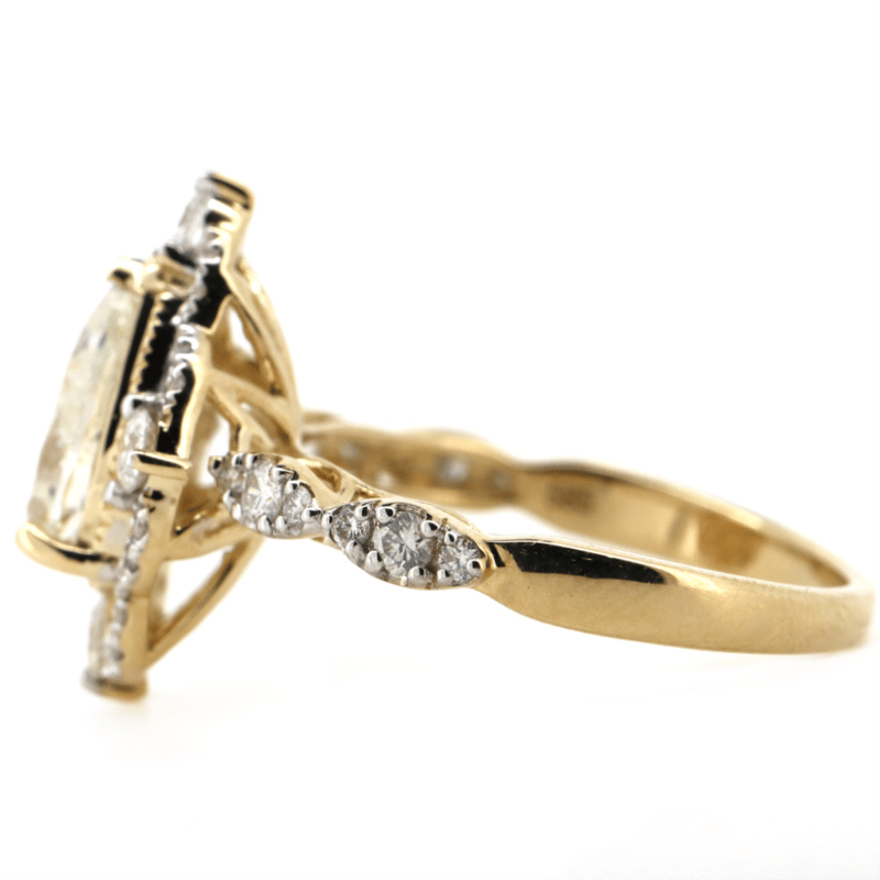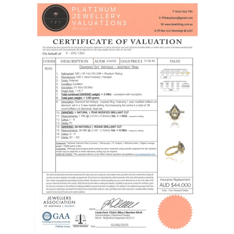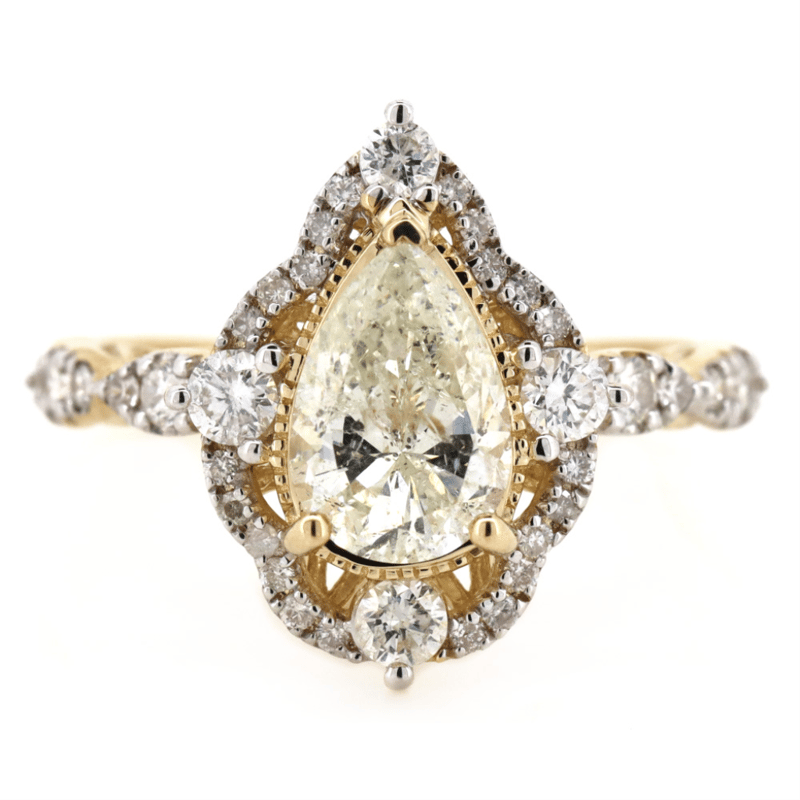 14K YELLOW GOLD AND DIAMOND, RING. The Centres Features, One Pear Modified Brilliant Cut, Diamond (1.50Ct, J-K Colour, P2 Clarity), Bead Set. Accompanying The Centre Are, 38 Round Brilliant Cut, Diamonds (0.58Ct Tdw, G-H Colour, Si1-Si2 Clarity), Bead Set. Ring Size O. Jewellery Valuations Provided By A Third Party Professional Not Directly Associated With Lloyds Auctions at AUD $44,000.00This Insurance Valuation has been provided by a registered Jewellery Valuer and is intended for insurance purposes only. The valuation amount has no bearing on the auction value of the item. Any questions regarding the valuation should be directed to the issuing Valuer (refer to contact details on the certificate) as Lloyds have no association or relationship with the Valuer or the valuation amount contained within the valuation. Condition: NEW 0645687+5066