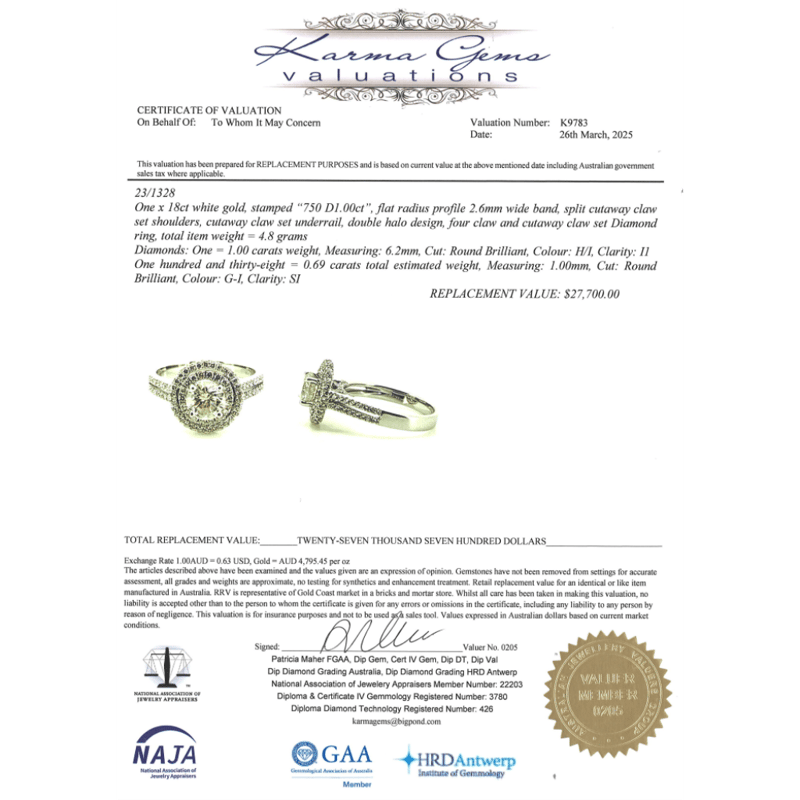 This Insurance Valuation has been provided by a registered Jewellery Valuer and is intended for insurance purposes only. The valuation amount has no bearing on the auction value of the item. Any questions regarding the valuation should be directed to the issuing Valuer (refer to contact details on the certificate) as Lloyds have no association or relationship with the Valuer or the valuation amount contained within the valuation.