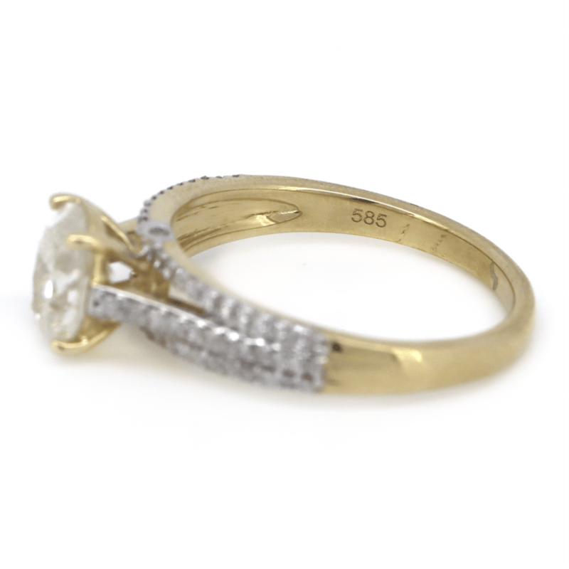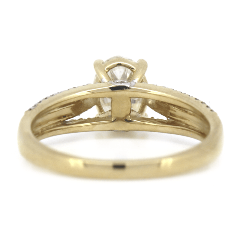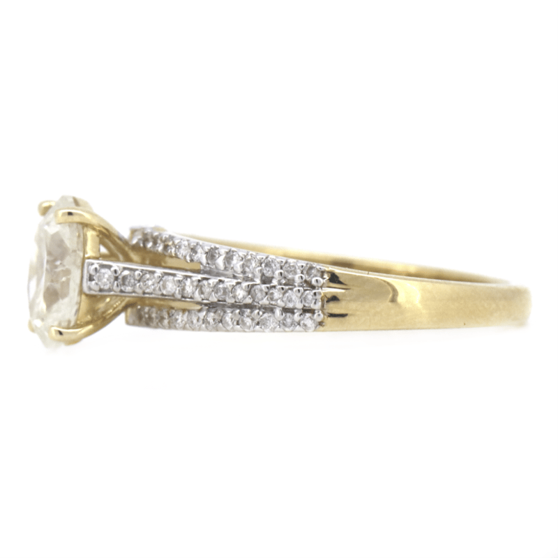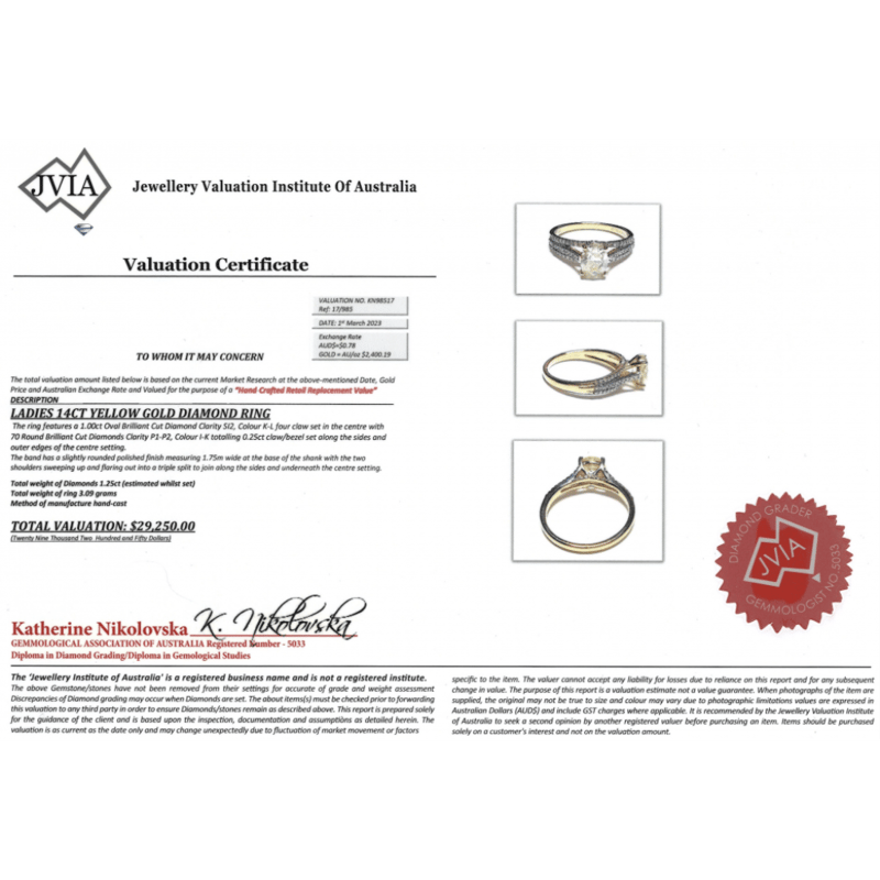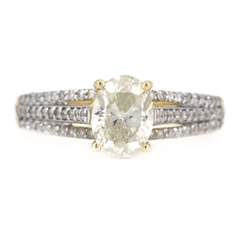 The Centre Features, One Oval Brilliant Cut, Diamond (1.00Ct, K-L Colour, Si2 Clarity), Claw Set. Decorating The Band Are, 70 Round Brilliant Cut, Diamonds (0.25Ct Tdw, I-K Colour, P1-P2 Clarity), Claw/Bezel Set. Ring Size M.