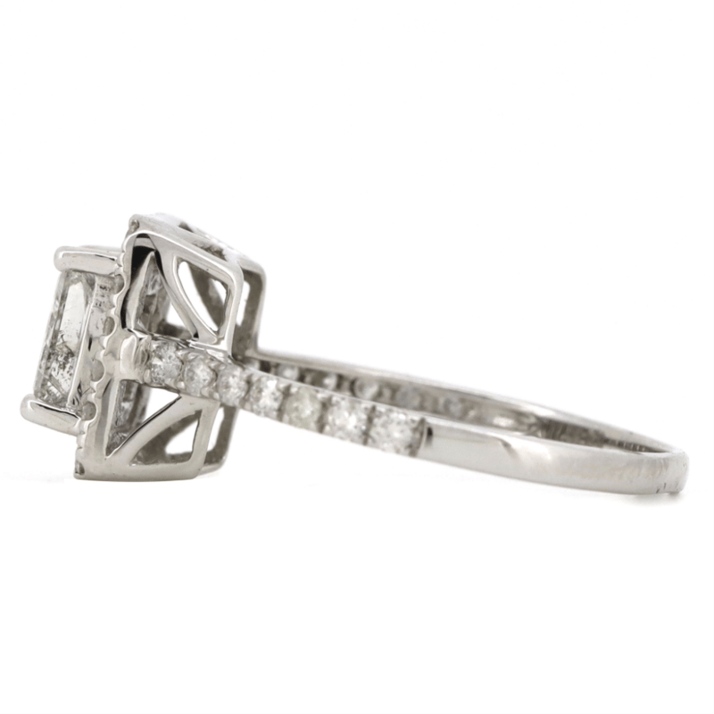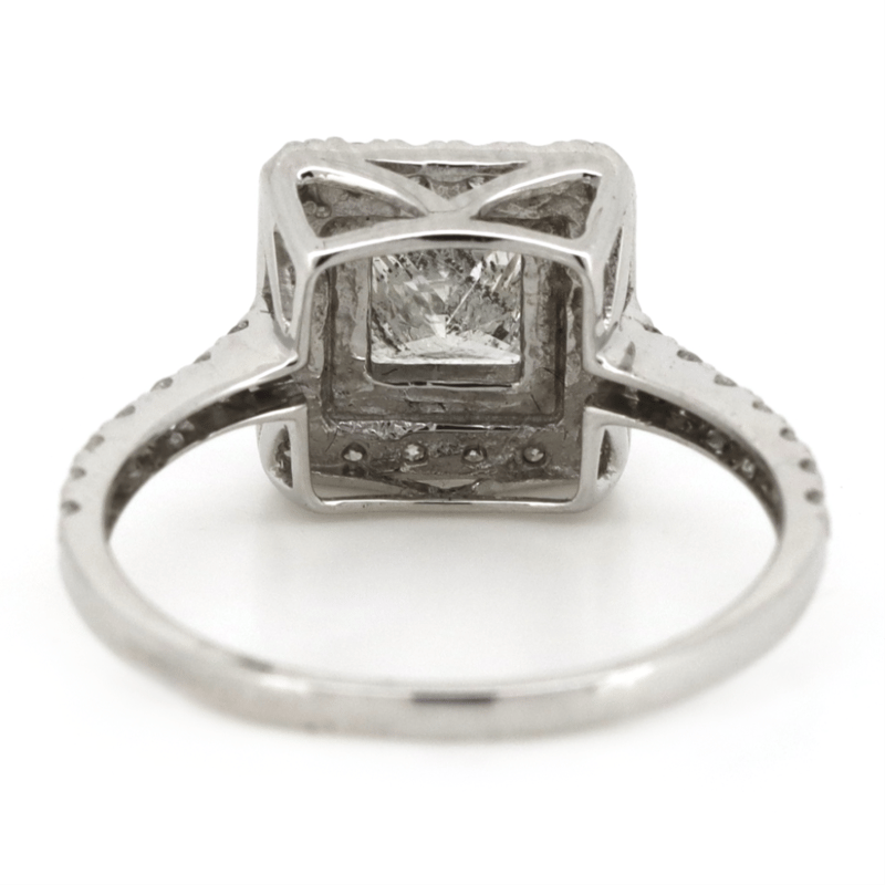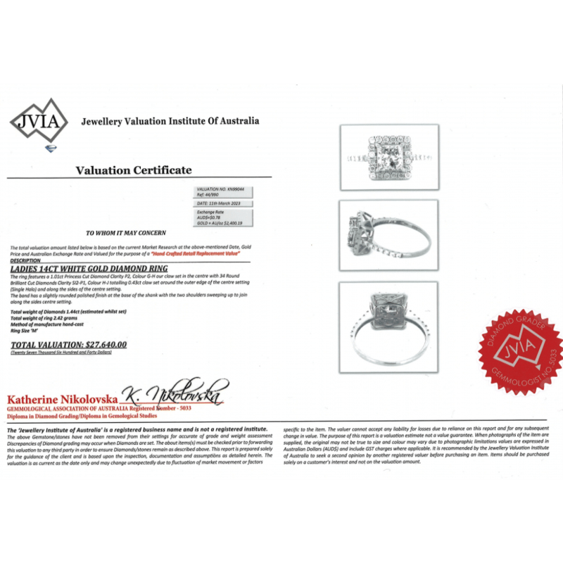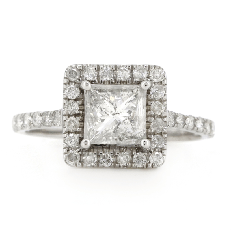 The Centre Features, One Princess Cut, Diamond (1.01Ct, G-H Colour, P2 Clarity), Claw Set. Surrounding The Centre And Decorating The Band Are, 34 Round Brilliant Cut, Diamonds (0.43Ct Tdw, H-J Colour, Si2-P2 Clarity), Claw Set. Ring Size M.