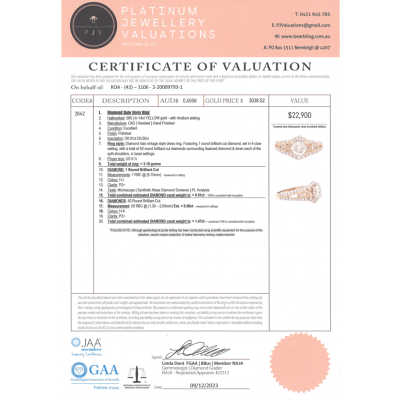 This Insurance Valuation has been provided by a registered Jewellery Valuer and is intended for insurance purposes only. The valuation amount has no bearing on the auction value of the item. Any questions regarding the valuation should be directed to the issuing Valuer (refer to contact details on the certificate) as Lloyds have no association or relationship with the Valuer or the valuation amount contained within the valuation.