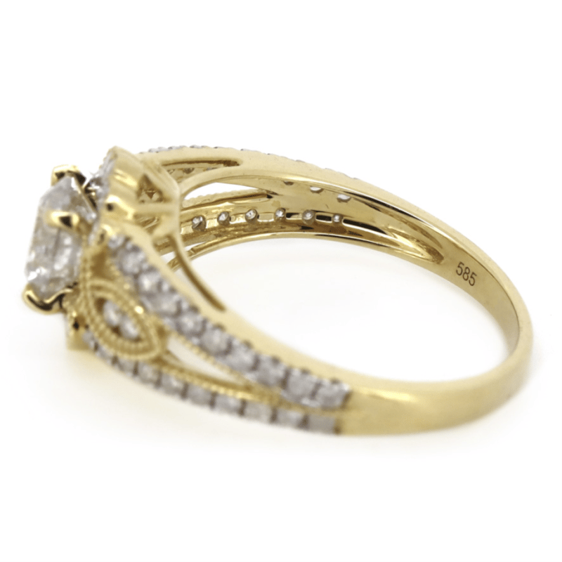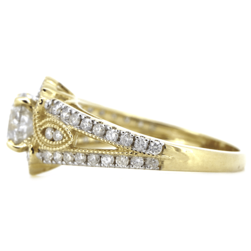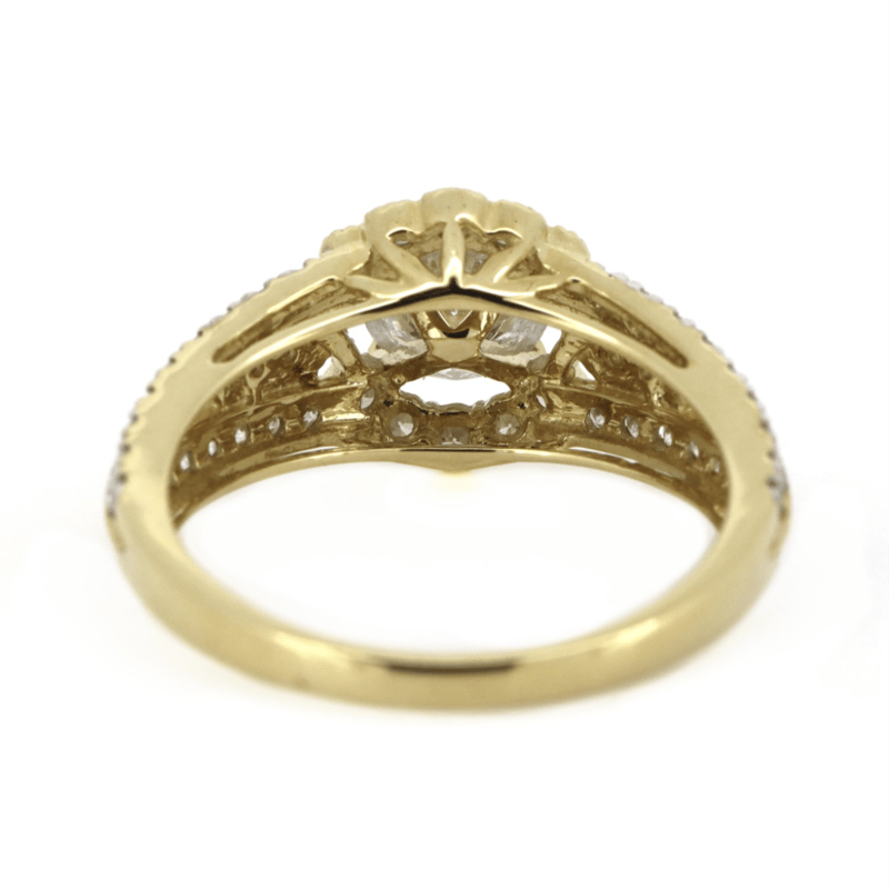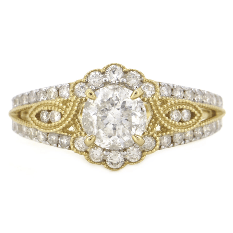 14K YELLOW GOLD AND DIAMOND, HALO FILIGREE RING.