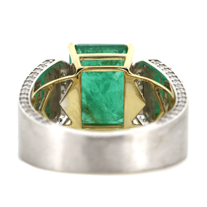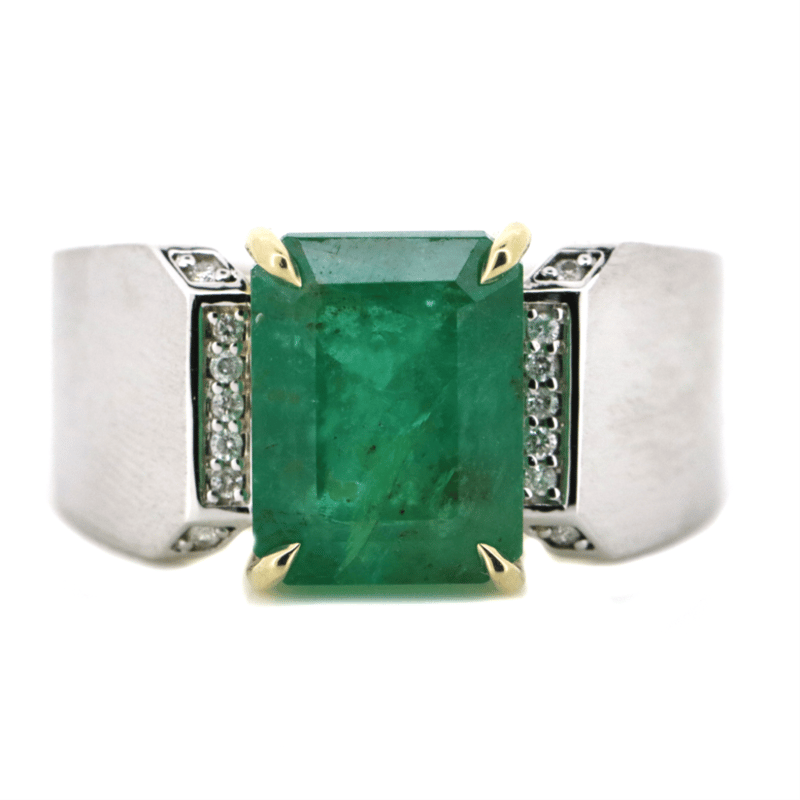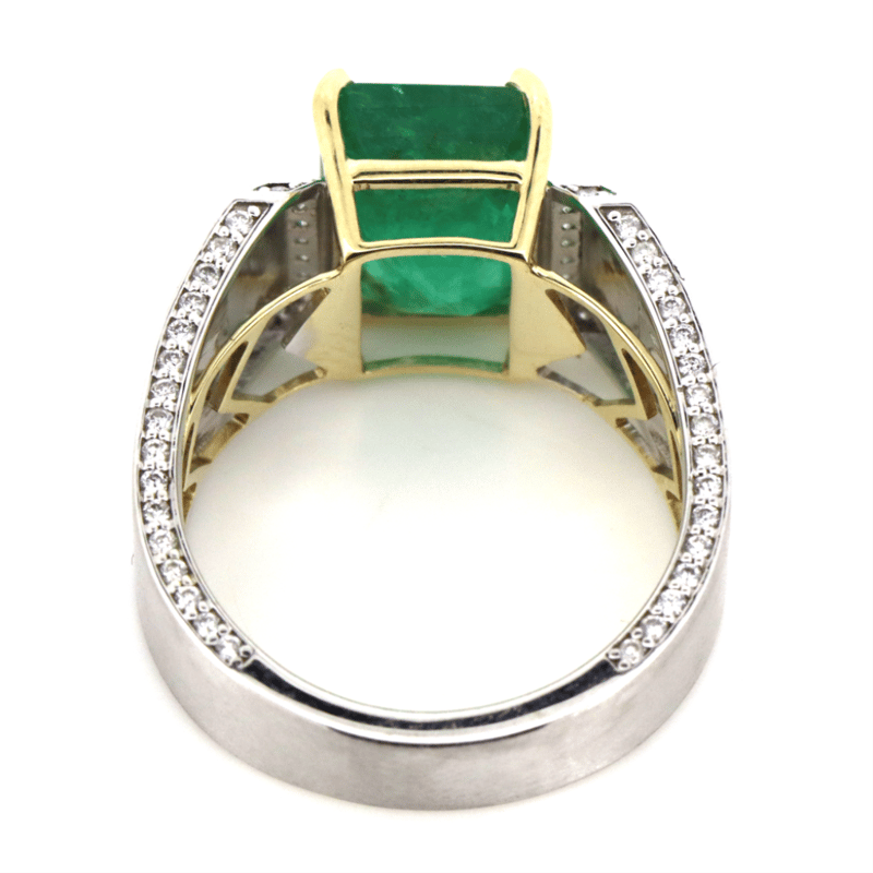 The Centre Features, One Emerald Cut, Medium-Dark Green, Emerald (4.45Ct, Moderate-Heavy Inclusions), 4 Tiger Claw Settings. Decorating The Shoulders Are, 78 Round Brilliant Cut, Diamonds (0.29Ct Tdw, G-J Colour, Si-I2 Clarity), Bead Set. Ring Size M.