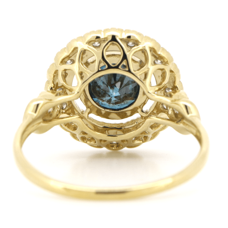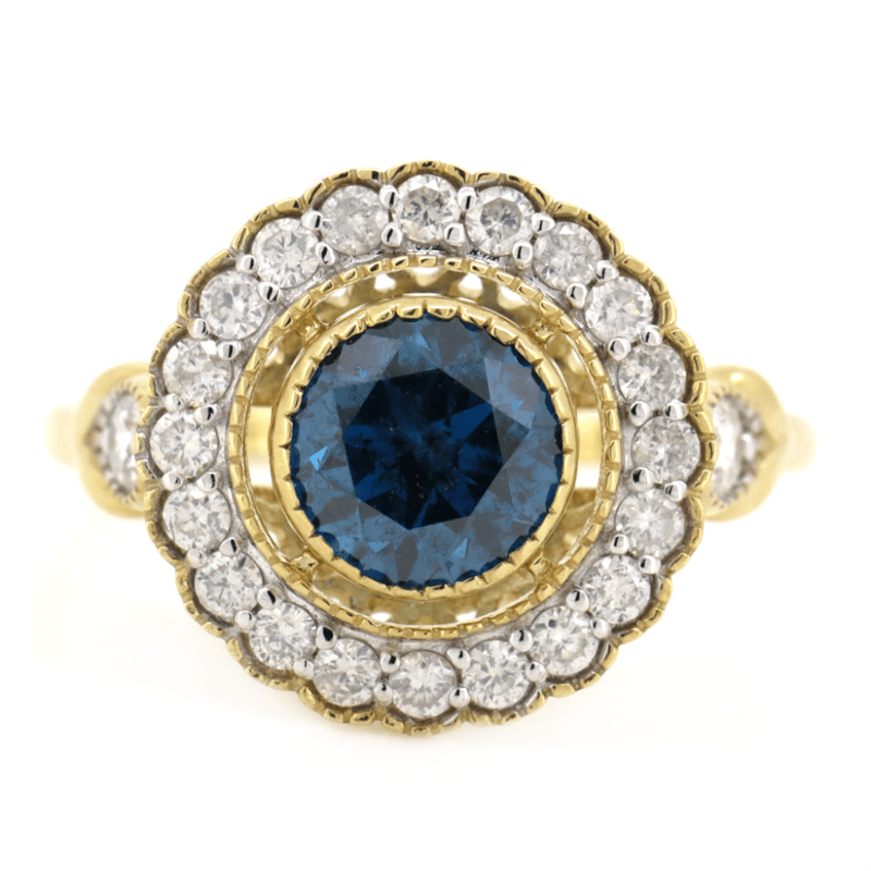 The Centre Features, One Round Brilliant Cut, Fancy Deep Blue, Diamond (1.20Ct, Si Clarity), Bezel Set. Surrounding The Centre In A Halo And Decorating The Band Are, 22 Round Brilliant Cut, Diamonds (0.47Ct Tdw, H-I Colour, Si-I2 Clarity), Bead Set With Millegrain Detail. Ring Size N.