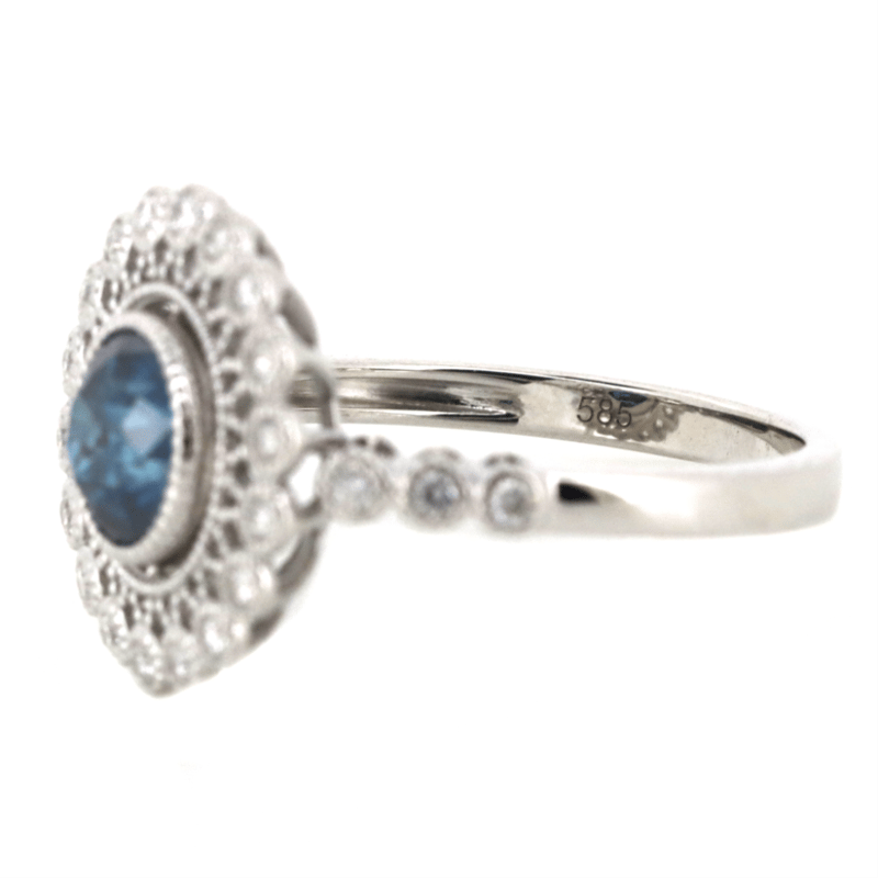 The Centre Features, One Round Cut, Fancy Vivid Blue, Diamond (1.01Ct, Heat Treated, Si1 Clarity), Bezel Set With Millegrain Detail. Surrounding The Centre In A Halo And Decorating The Band Are, 24 Round Brilliant Cut, Diamonds (0.26Ct Tdw, H-J Colour, Si-I2 Clarity), Bezel Set With Millegrain Detail. Ring Size M.