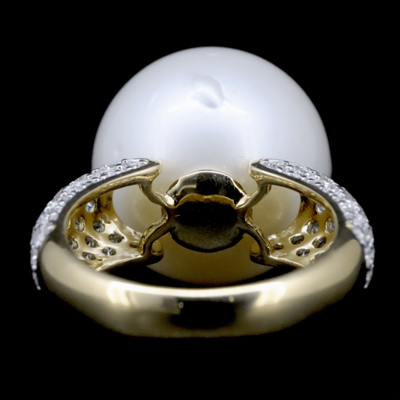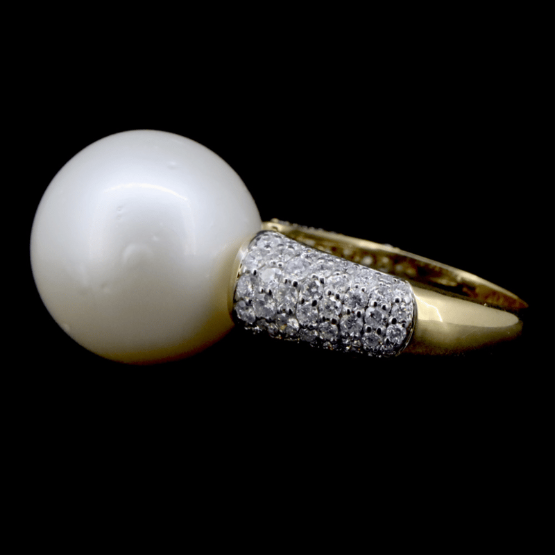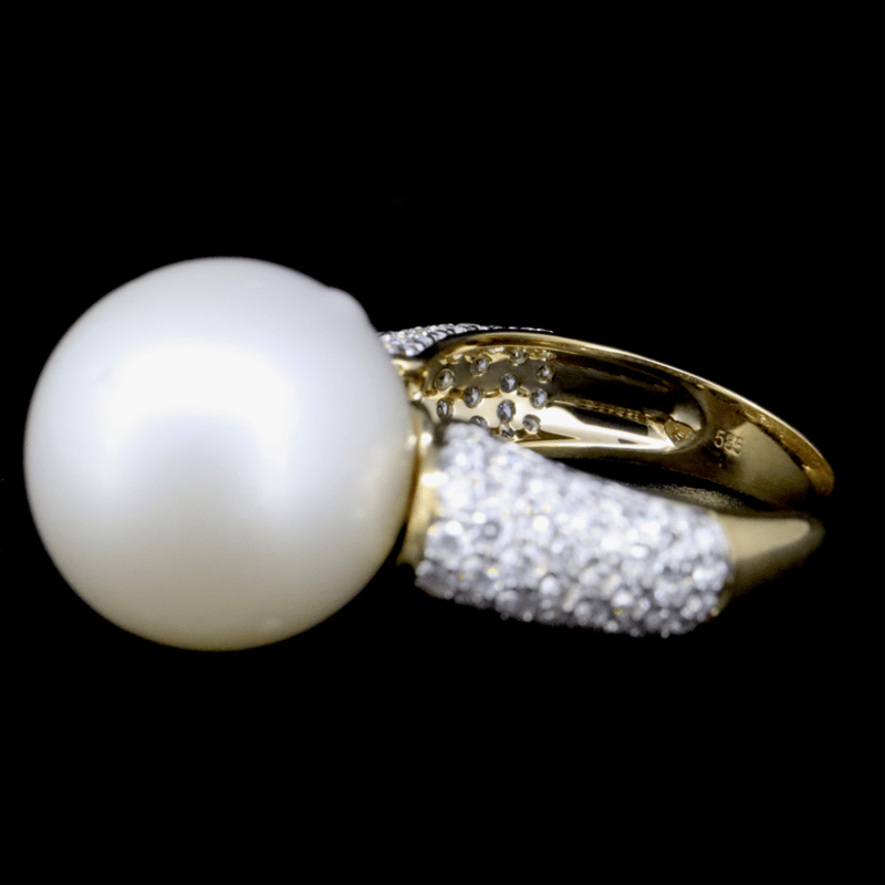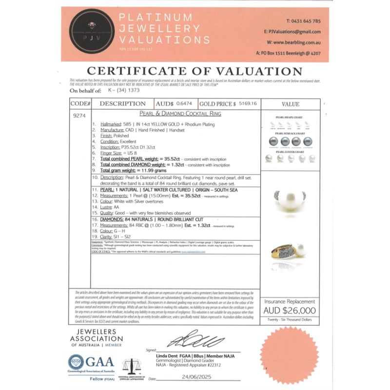 14K YELLOW GOLD, WHITE CULTURED SOUTH SEA PEARL AND DIAMOND, COCKTAIL RING. The Centre Features One Near Round, White Cultured South Sea Pearl (35.52Ct/15.00Mm Size, Aa Lustre, Slightly Blemished). Decorating The Band Are, 84 Round Brilliant Cut, Diamonds (1.32Ct Tdw, G-H Colour, Si1-Si2 Clarity), Pave Set In White Gold. Ring Size P 1/2. Jewellery Valuations Provided By A Third Party Professional Not Directly Associated With Lloyds Auctions at AUD $26,000.00This Insurance Valuation has been provided by a registered Jewellery Valuer and is intended for insurance purposes only. The valuation amount has no bearing on the auction value of the item. Any questions regarding the valuation should be directed to the issuing Valuer (refer to contact details on the certificate) as Lloyds have no association or relationship with the Valuer or the valuation amount contained within the valuation. Condition: NEW 0645687+5014
