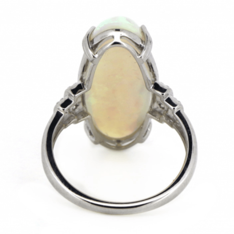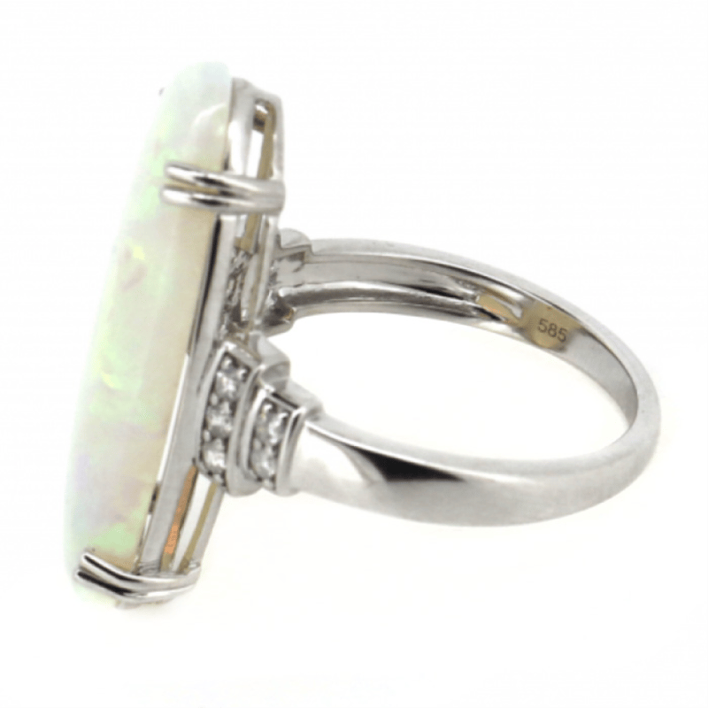 The Centre Features, One Oval Cabochon Cut, Andamooka Opal (5.86Ct, Colour Play Of Green-Yellow-Blue-Pastel Pink), Double 4 Claw Set. Decorating The Shoulders Are, 10 Round Brilliant Cut, Diamonds (0.15Ct Tdw, H-J Colour, P1 Clarity), Bead Set. Ring Size N 1/2.