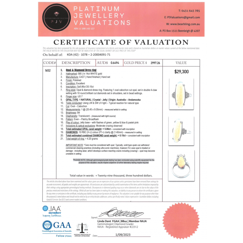 This Insurance Valuation has been provided by a registered Jewellery Valuer and is intended for insurance purposes only. The valuation amount has no bearing on the auction value of the item. Any questions regarding the valuation should be directed to the issuing Valuer (refer to contact details on the certificate) as Lloyds have no association or relationship with the Valuer or the valuation amount contained within the valuation.
