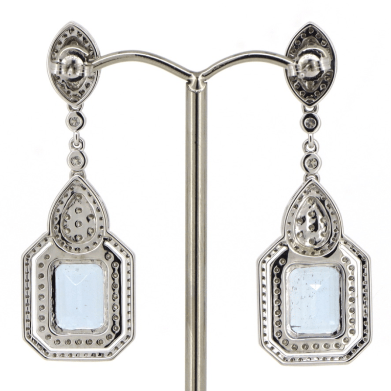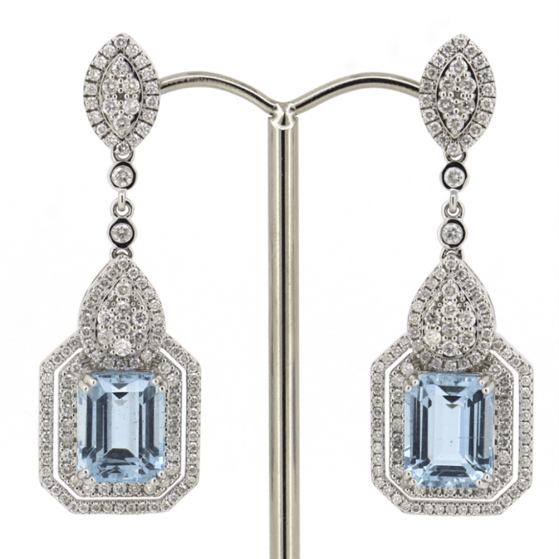 14K WHITE GOLD, AQUAMARINE AND DIAMOND, DECORATIVE DROP EARRINGS. The Designs Feature, 2 Square Step Cut, Strong Light Blue, Aquamarines (9.53Ct Tsw, Slightly Included), Double 4 Claw Set. Decorating The Design Are, 240 Round Brilliant Cut, Diamonds (1.99Ct Tdw, G-H Colour, Si1-Si2 Clarity), Bead Set. The Earrings Have Post Backs With, 14K White Gold Butterfly Clasps. Jewellery Valuations Provided By A Third Party Professional Not Directly Associated With Lloyds Auctions at AUD $36,000.00This Insurance Valuation has been provided by a registered Jewellery Valuer and is intended for insurance purposes only. The valuation amount has no bearing on the auction value of the item. Any questions regarding the valuation should be directed to the issuing Valuer (refer to contact details on the certificate) as Lloyds have no association or relationship with the Valuer or the valuation amount contained within the valuation. Condition: NEW 0645687+5013