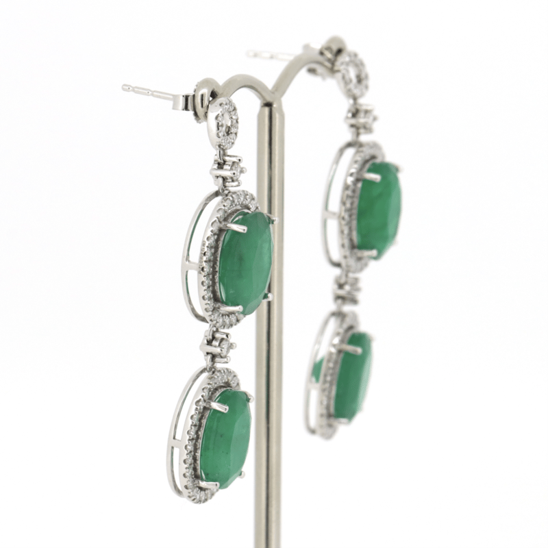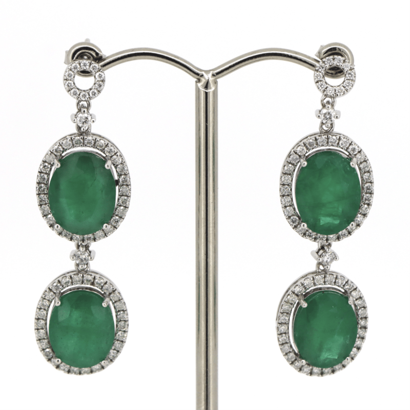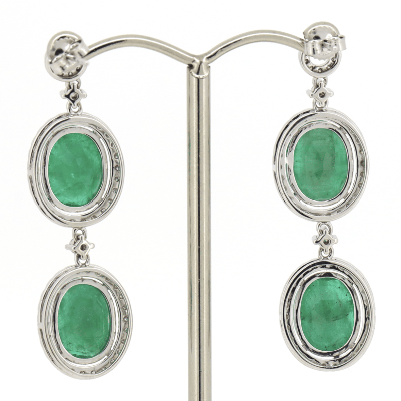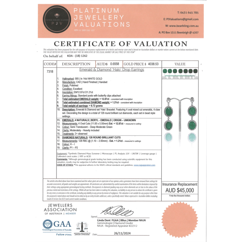 14K WHITE GOLD, EMERALD AND DIAMOND, DOUBLE DROP EARRINGS. The Earrings Feature, 4 Oval Cut, Deep Moderate Green, Emeralds (12.87Ct Tsw, Moderate-Heavily Included), 4 Claw Set. Encompassing The Centre In A Halo Are, 128 Round Brilliant Cut, Diamonds (1.21Ct Tdw, H-I Colour, P1-P2 Clarity), Bead Set. The Earrings Feature, Standard Post Backs With Butterfly Clasps. Jewellery Valuations Provided By A Third Party Professional Not Directly Associated With Lloyds Auctions at AUD $45,000.00This Insurance Valuation has been provided by a registered Jewellery Valuer and is intended for insurance purposes only. The valuation amount has no bearing on the auction value of the item. Any questions regarding the valuation should be directed to the issuing Valuer (refer to contact details on the certificate) as Lloyds have no association or relationship with the Valuer or the valuation amount contained within the valuation. Condition: NEW 0645687+5059