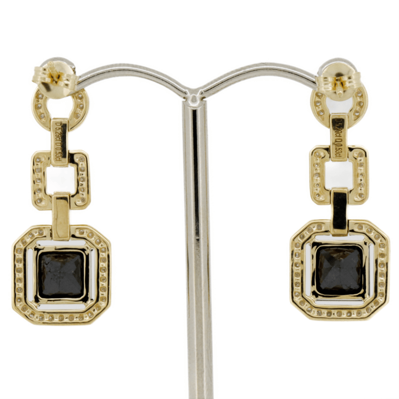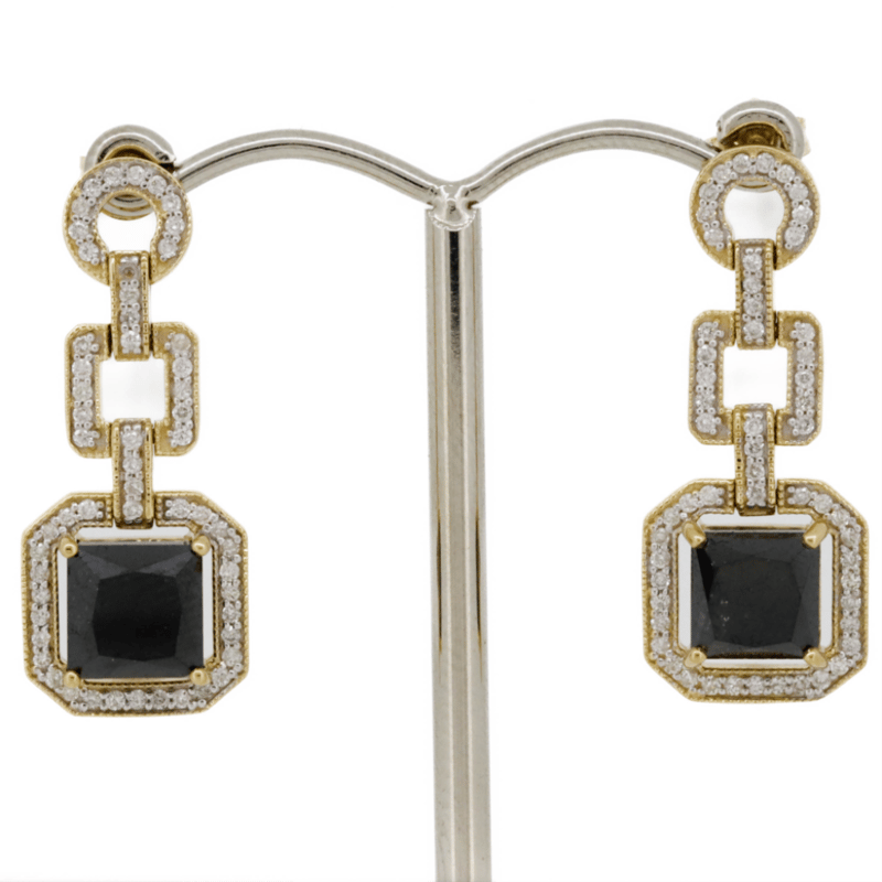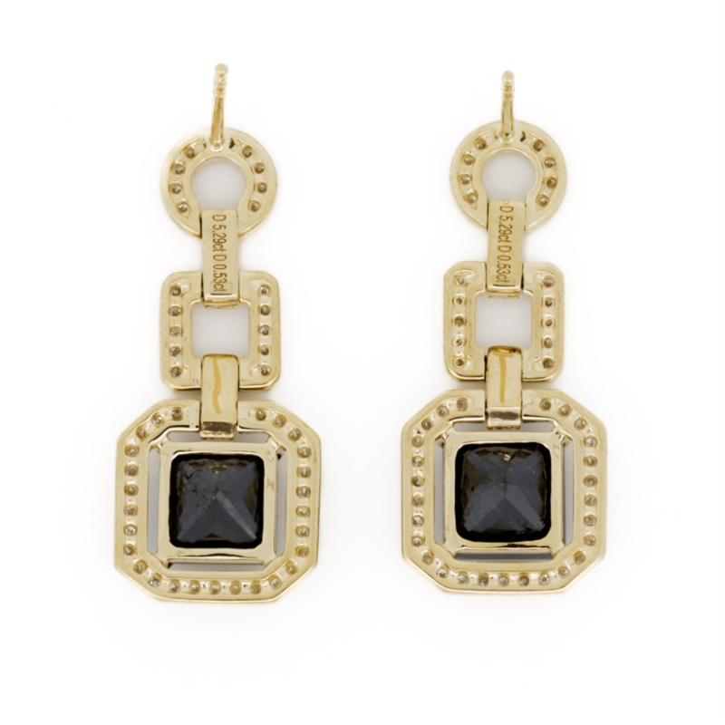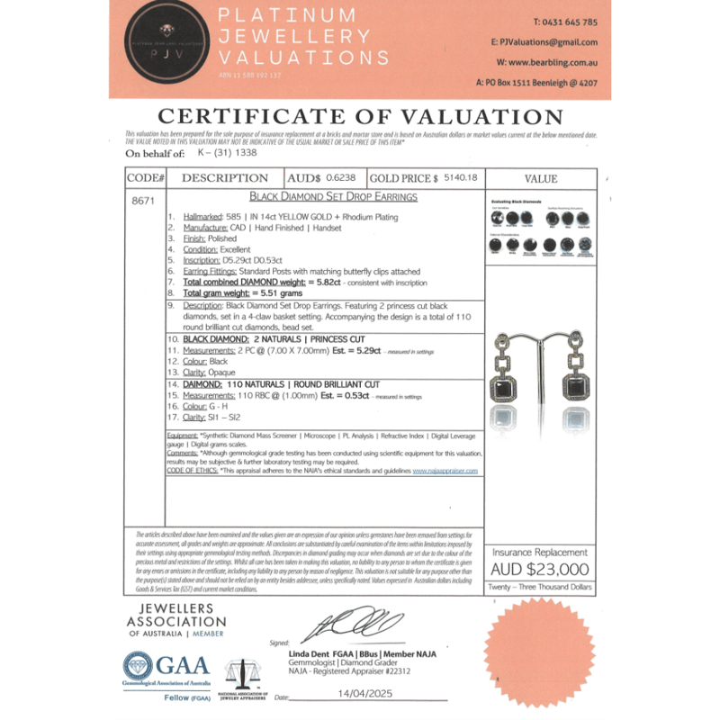 14K YELLOW GOLD, BLACK DIAMOND AND DIAMOND, DROP EARRINGS. The Design Features, 2 Princess Cut, Black, Diamonds (5.29Ct Tdw, Opaque), 4 Claw Set. Accompanying The Design Are, 110 Round Brilliant Cut, Diamonds (0.53Ct Tdw, G-H Colour, Si1-Si2 Clarity), Bead Set In White Gold. The Earrings Have Post Backs, With 14K Yellow Gold Butterfly Clasps. Jewellery Valuations Provided By A Third Party Professional Not Directly Associated With Lloyds Auctions at AUD $23,000.00This Insurance Valuation has been provided by a registered Jewellery Valuer and is intended for insurance purposes only. The valuation amount has no bearing on the auction value of the item. Any questions regarding the valuation should be directed to the issuing Valuer (refer to contact details on the certificate) as Lloyds have no association or relationship with the Valuer or the valuation amount contained within the valuation. Condition: NEW 0645687+5042