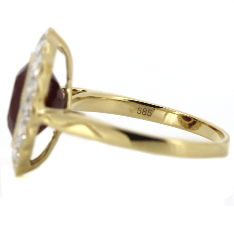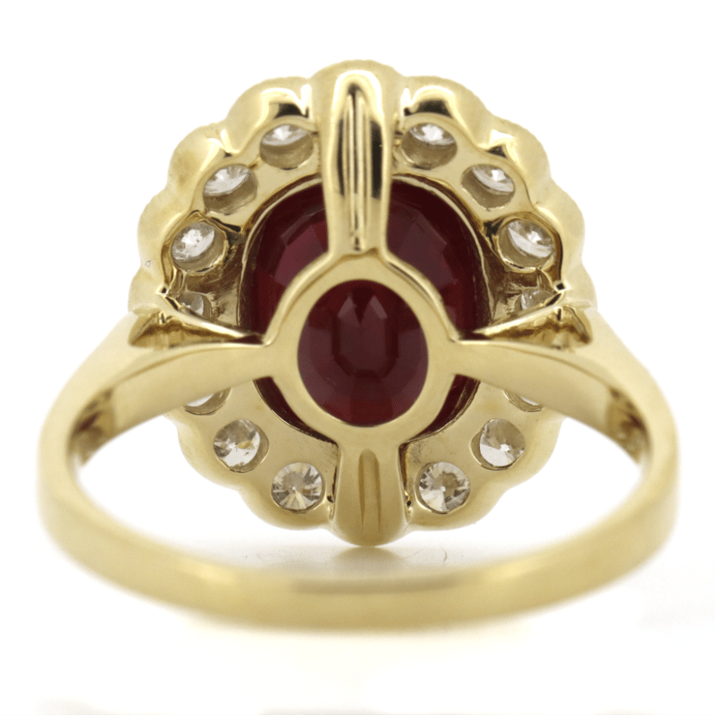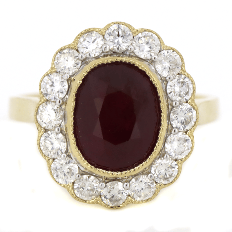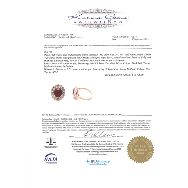14K WHITE GOLD, RUBY AND DIAMOND, HALO RING. The Centre Features, One Oval Cut, Ruby (4.49Ct, Moderate Natural Inclusions), Bezel Set With Millegrain Detail. Surrounding The Centre Are, 16 Round Brilliant Cut, Diamonds (1.16Ct Tdw, G-H Colour, Si1-2 Clarity), Semi-Bezel/Bead Set With Millegrain Detail. Ring Size P. Jewellery Valuations Provided By A Third Party Professional Not Directly Associated With Lloyds Auctions at AUD $48,100.00This Insurance Valuation has been provided by a registered Jewellery Valuer and is intended for insurance purposes only. The valuation amount has no bearing on the auction value of the item. Any questions regarding the valuation should be directed to the issuing Valuer (refer to contact details on the certificate) as Lloyds have no association or relationship with the Valuer or the valuation amount contained within the valuation. Condition: NEW 0645687+5036