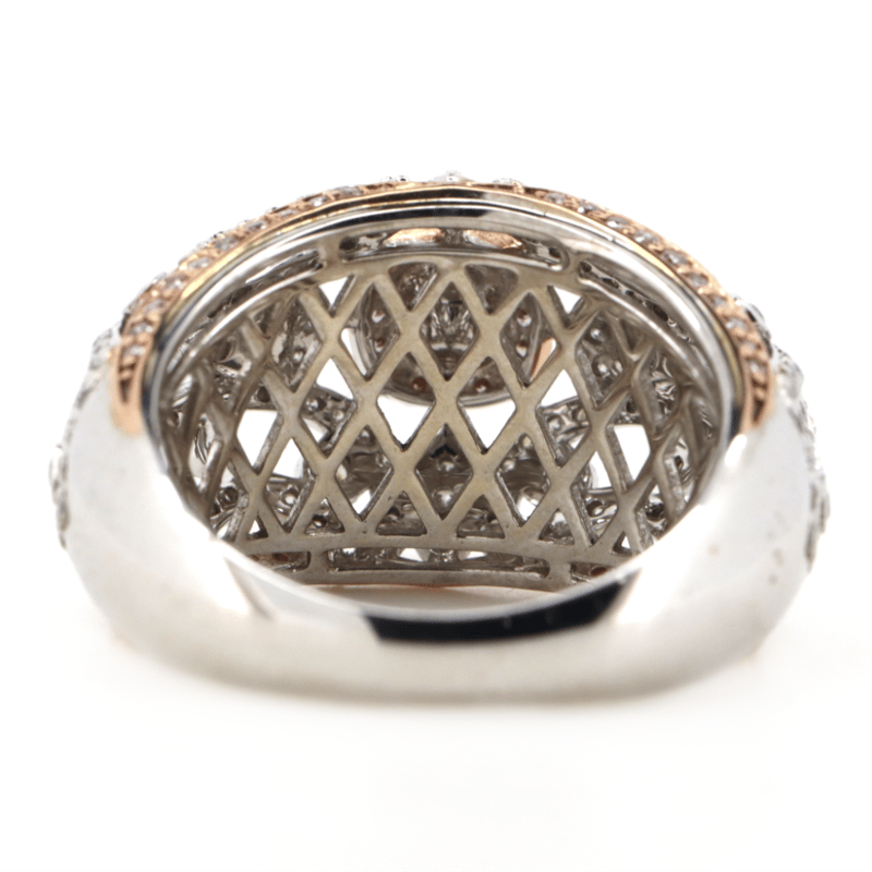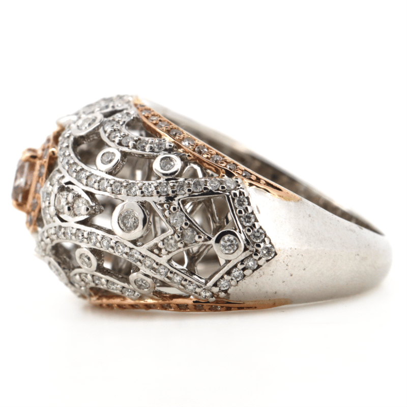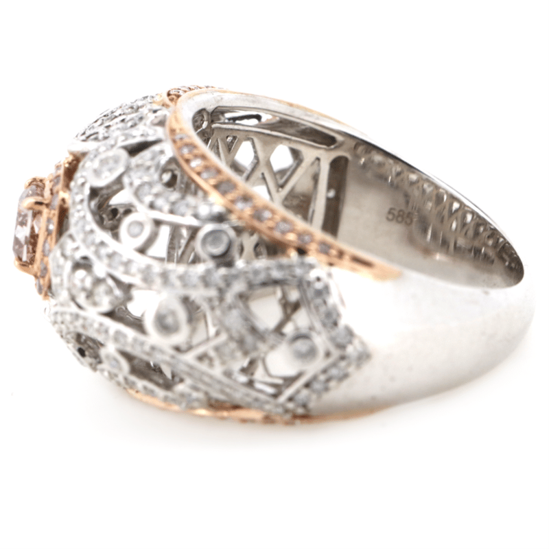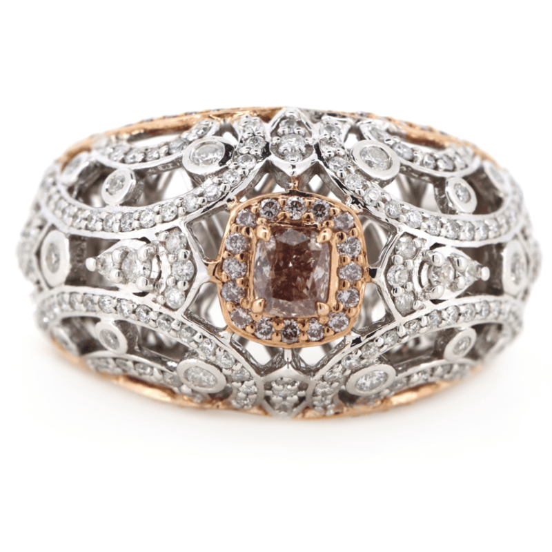 The Centre Features, One Cushion Modified Cut, Fancy Brown/Blush Pink, Diamond (0.32Ct Tdw, P2 Clarity), 4 Claw Set In Rose Gold. Surrounding The Centre Are, 56 Round Brilliant Cut, Fancy Brown/Blush Pink, Diamonds (0.27Ct Tdw, P2+ Clarity), Bead Set In Rose Gold. Encompassing The Design Are, 152 Round Brilliant Cut, Diamonds (0.73Ct Tdw, H-J Colour, P1 Clarity), Micro-Bead/Bezel Set In White Gold. Ring Size O.