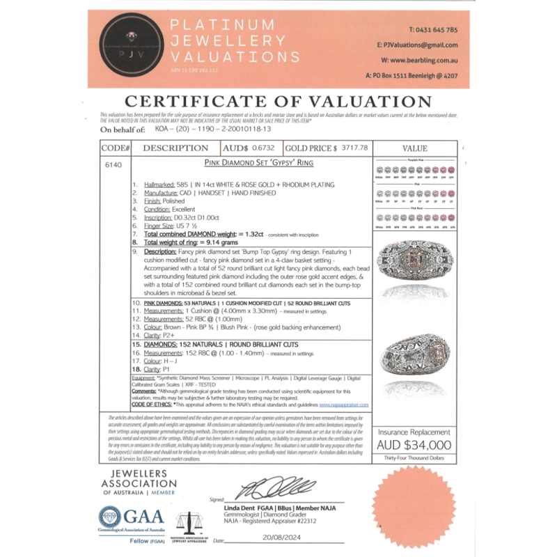 This Insurance Valuation has been provided by a registered Jewellery Valuer and is intended for insurance purposes only. The valuation amount has no bearing on the auction value of the item. Any questions regarding the valuation should be directed to the issuing Valuer (refer to contact details on the certificate) as Lloyds have no association or relationship with the Valuer or the valuation amount contained within the valuation.