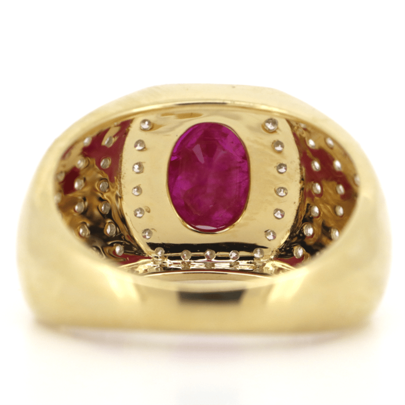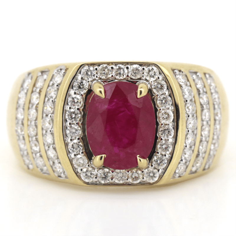 The Centre Features, One Oval Cut, Ruby (2.87Ct, Moderate-Heavily Included), Claw Set. Surrounding The Centre And Decorating The Band Are, 60 Round Brilliant Cut, Diamonds (0.86Ct Tdw, G-H Colour, Si-I1 Clarity, ), Micro-Claw Set. Ring Size R 1/2.