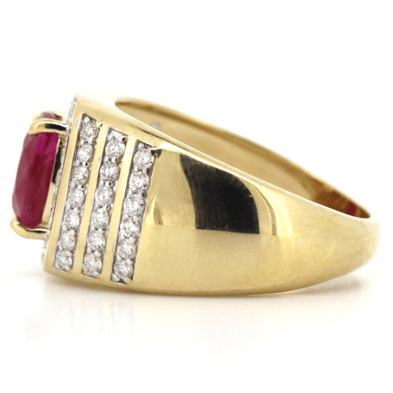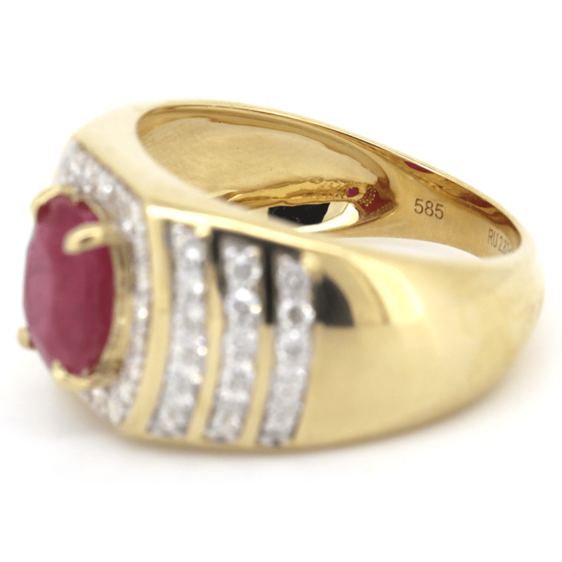 14K YELLOW GOLD, RUBY AND DIAMOND, GENTS RING.