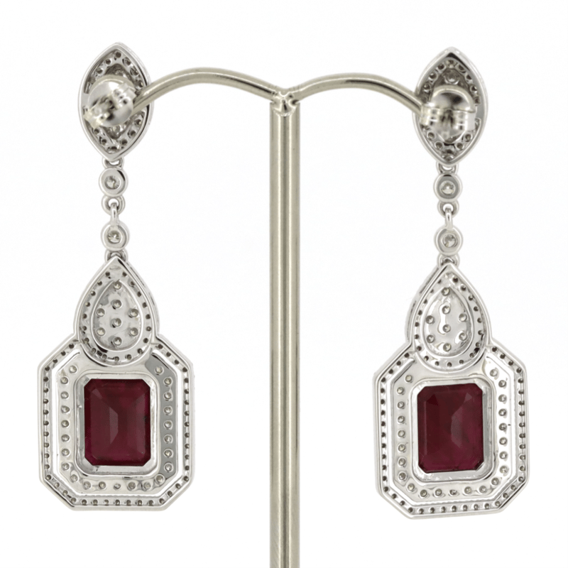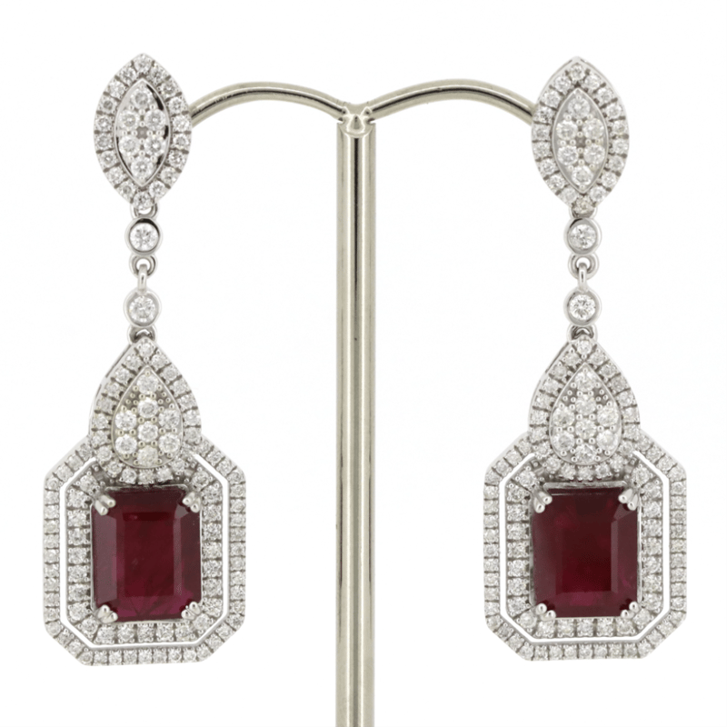 The Centres Feature, 2 Emerald Cut, Deep Red, Rubies (6.78Ct Tsw, Moderate Included), Double 4 Claw Set. Decorating The Designs Are, 240 Round Brilliant Cut, Diamonds (2.06Ct Tdw, H-J Colour, Si-I2+ Clarity), Bead Set. The Earrings Have Post Backs With, 14K White Gold Butterfly Clasps.