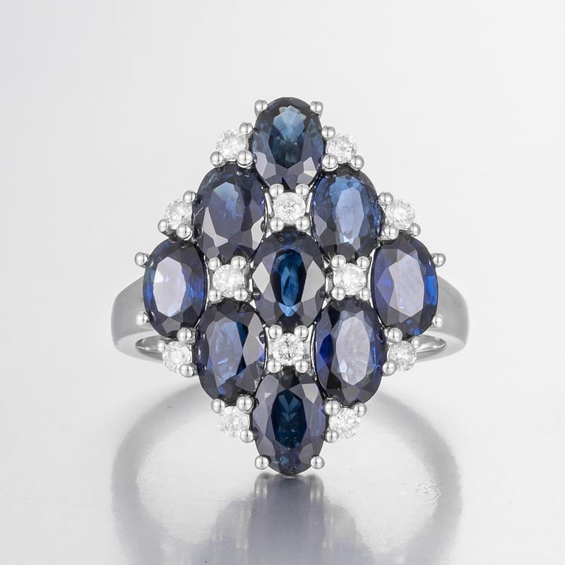 14Ct White Gold Australian Sapphire And Diamond Cluster Ring Featuring Centre, 9 Oval Cut, Deep Royal Blue Sapphires (5.67Ct Tsw, Moderately Included), Claw Set, With 12 Round Brilliant Cut Diamonds (0.26Ct Tdw, F-G Colour, Vs2-Si1 Clarity), 4 Claw Set. Ring Size O.