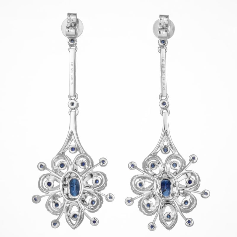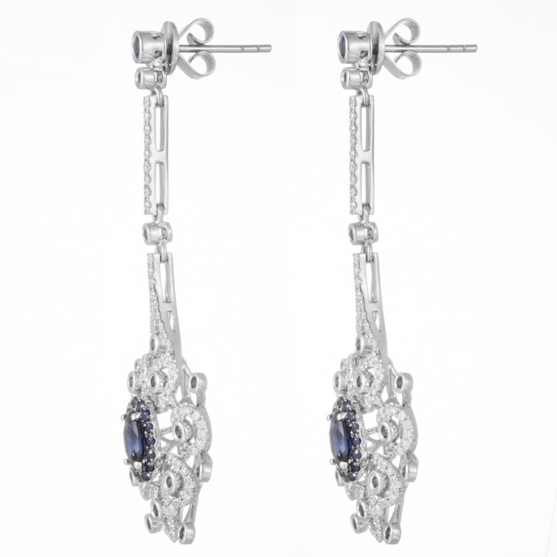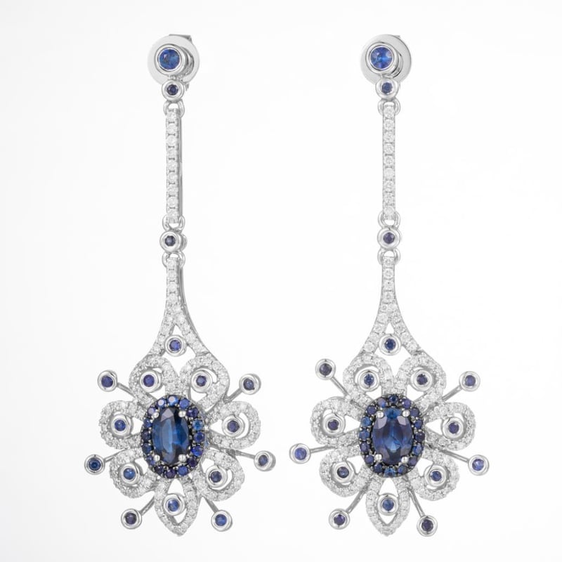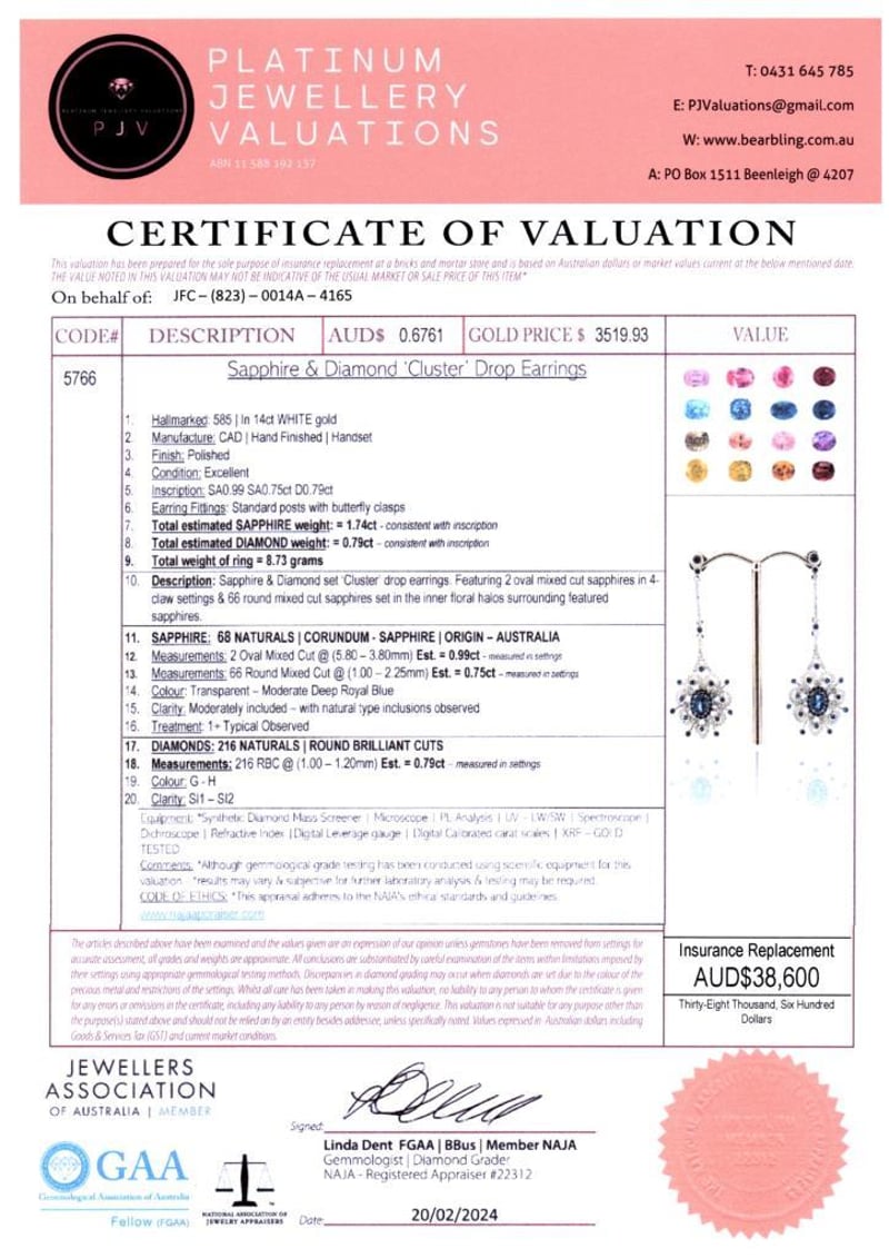 14CT WHITE GOLD AUSTRALIAN SAPPHIRE AND DIAMOND DROP EARRINGS 14Ct White Gold Australian Sapphire And Diamond Drop Earrings Featuring Centre, 2 Oval And 66 Round Cut, Moderate Deep Royal Blue Australian Sapphires (1.74Ct Tsw, Moderately Included), Claw/Bezel Set, With 216 Round Brilliant Cut Diamonds (0.79Ct Tdw, G-H Colour, Si1-Si2 Clarity), Bead Set. Jewellery Valuations Provided By A Third Party Professional Not Directly Associated With Lloyds Auctions at AUD $38600This Insurance Valuation has been provided by a registered Jewellery Valuer and is intended for insurance purposes only. The valuation amount has no bearing on the auction value of the item. Any questions regarding the valuation should be directed to the issuing Valuer (refer to contact details on the certificate) as Lloyds have no association or relationship with the Valuer or the valuation amount contained within the valuation. 0585012+567