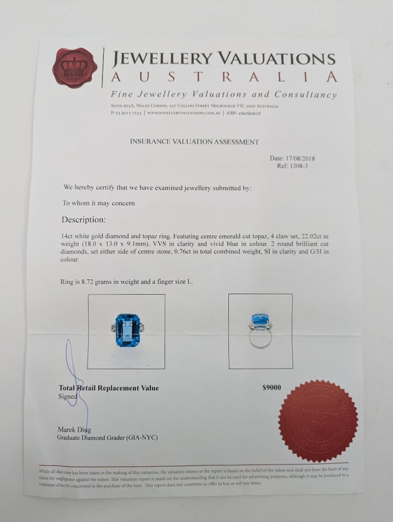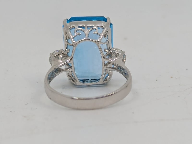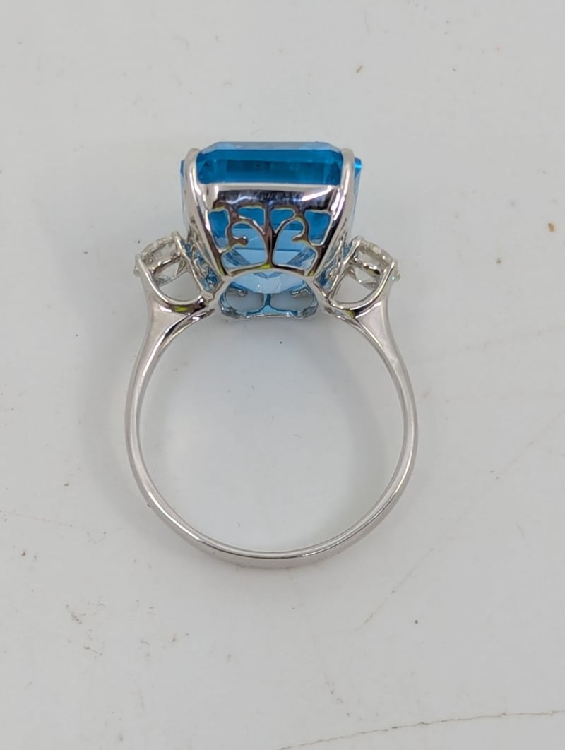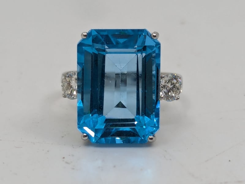 Featuring One 22.02Ct Emerald Cut Topaz, Clarity: Vvs, Colour: Vivid Blue With Two 0.76Tcw Round Brilliant Cut Diamonds, Clarity: Si, Colour: G/H On Either Side Of Center Topaz