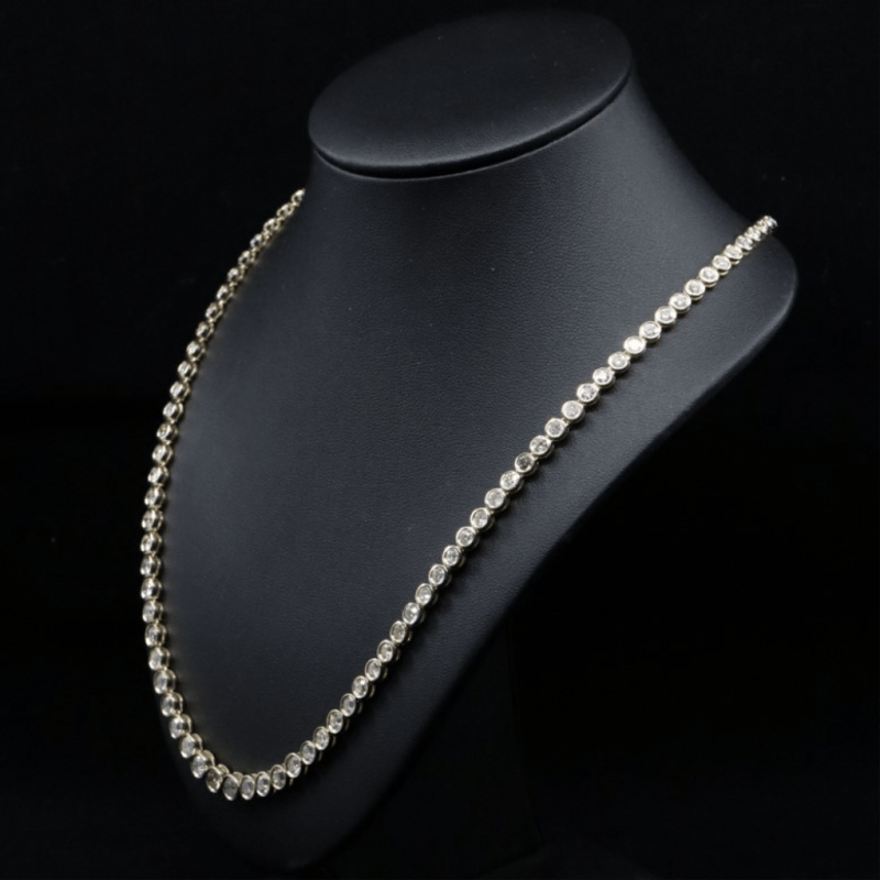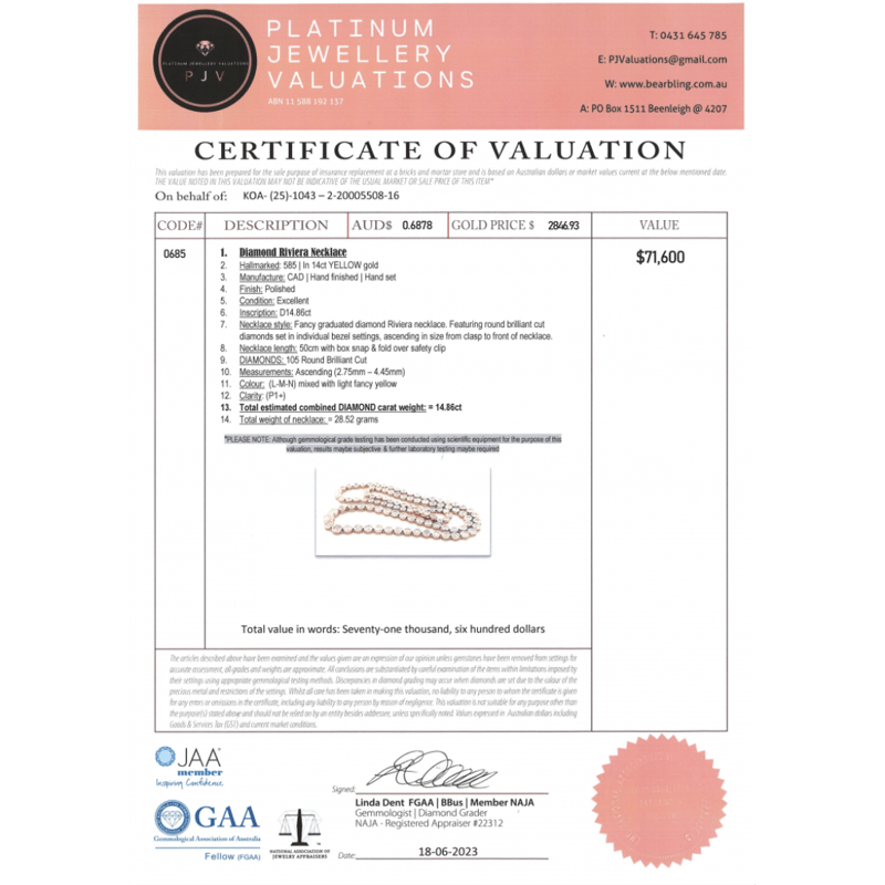 14K Yellow Gold, 14.86Ct Tdw Diamond, Riviera Necklace. The Design Features, 105 Round Brilliant Cut, Mixed Light Fancy Yellow, Diamonds (14.86Ct Tdw, L-M-N Colour, P1+ Clarity), Bezel Set. Necklace Has Box Clasp And Safety Latch. Necklace Length Is 50Cm.