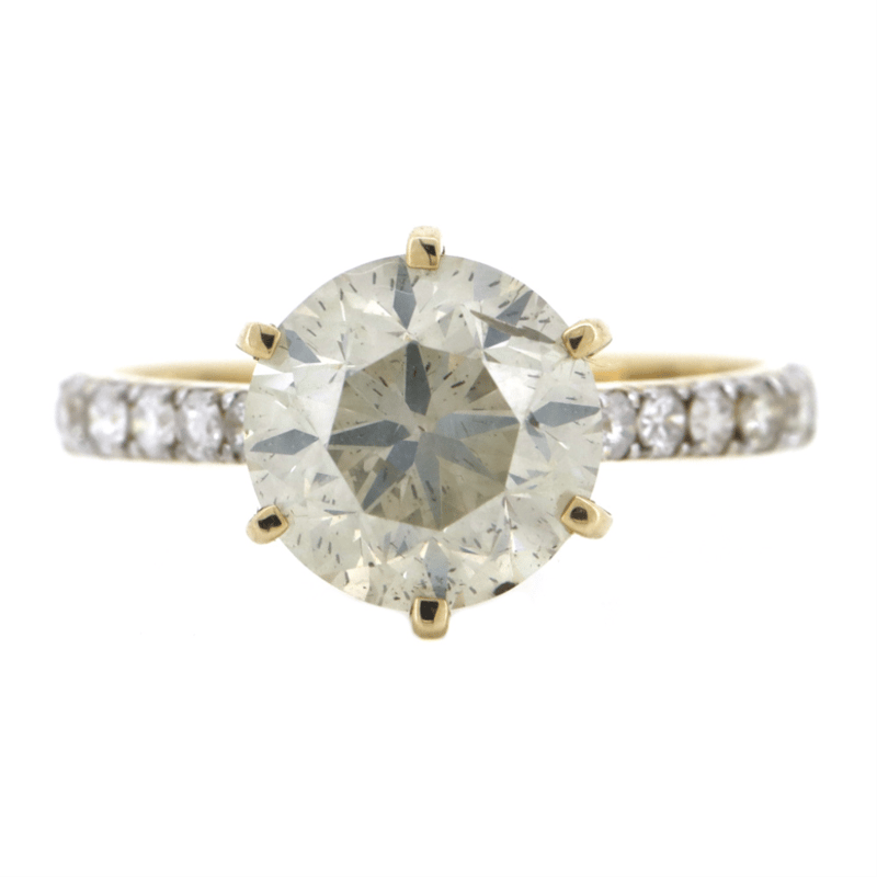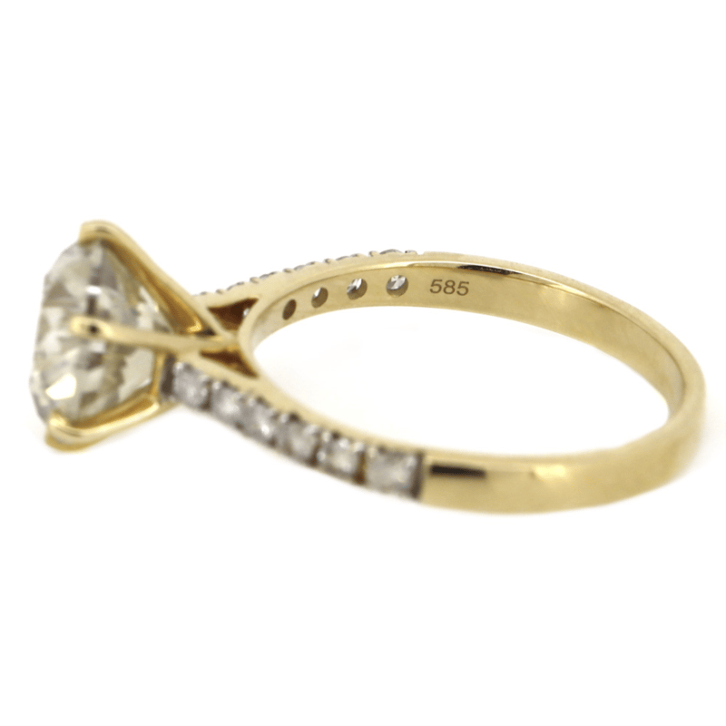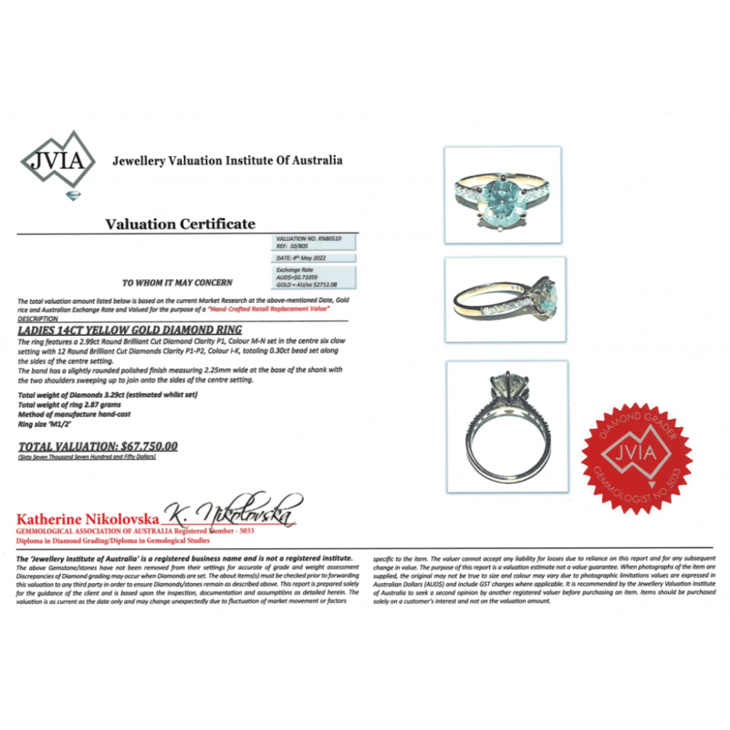 14K YELLOW GOLD AND DIAMOND, CLASSIC RING. The Centre Features, One Round Brilliant Cut, Diamond (2.99Ct, M-N Colour, P1 Clarity), 6 Claw Set. Decorating The Band Are, 12 Round Brilliant Cut, Diamonds (0.30Ct Tdw, I-K Colour, P1-P2 Clarity), Bead Set. Ring Size M 1/2. 14K Yellow Gold And Diamond, Classic Ring. The Centre Features, One Round Brilliant Cut, Diamond (2.99Ct, M-N Colour, P1 Clarity), 6 Claw Set. Decorating The Band Are, 12 Round Brilliant Cut, Diamonds (0.30Ct Tdw, I-K Colour, P1-P2 Clarity), Bead Set. Ring Size M 1/2. Jewellery Valuations Provided By A Third Party Professional Not Directly Associated With Lloyds Auctions at AUD $67,750.00This Insurance Valuation has been provided by a registered Jewellery Valuer and is intended for insurance purposes only. The valuation amount has no bearing on the auction value of the item. Any questions regarding the valuation should be directed to the issuing Valuer (refer to contact details on the certificate) as Lloyds have no association or relationship with the Valuer or the valuation amount contained within the valuation. Condition: NEW 0645883+5032