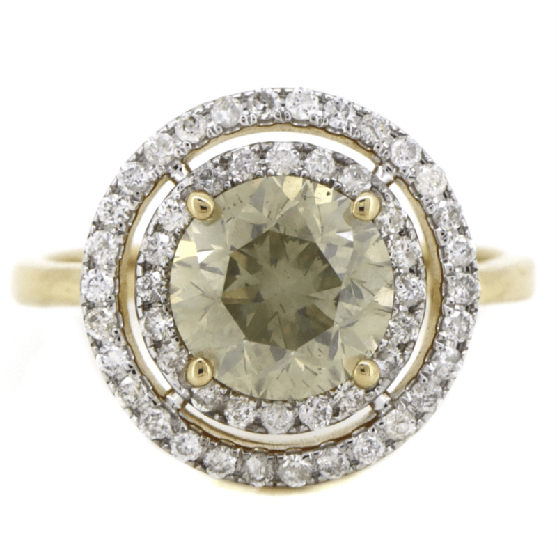 14K Yellow Gold, Fancy Champagne Diamond, Double Halo Ring. The Centre Features, One Round Brilliant Cut, Light Fancy Champagne, Diamond (2.00Ct, P2 Clarity), 4-Claw Set. Surrounding The Centre In A Double Halo Are, 48 Round Brilliant Cut, Diamonds (0.24Ct Tdw, H-K Colour, P1+ Clarity), Bead Set. Ring Size N 1/2.