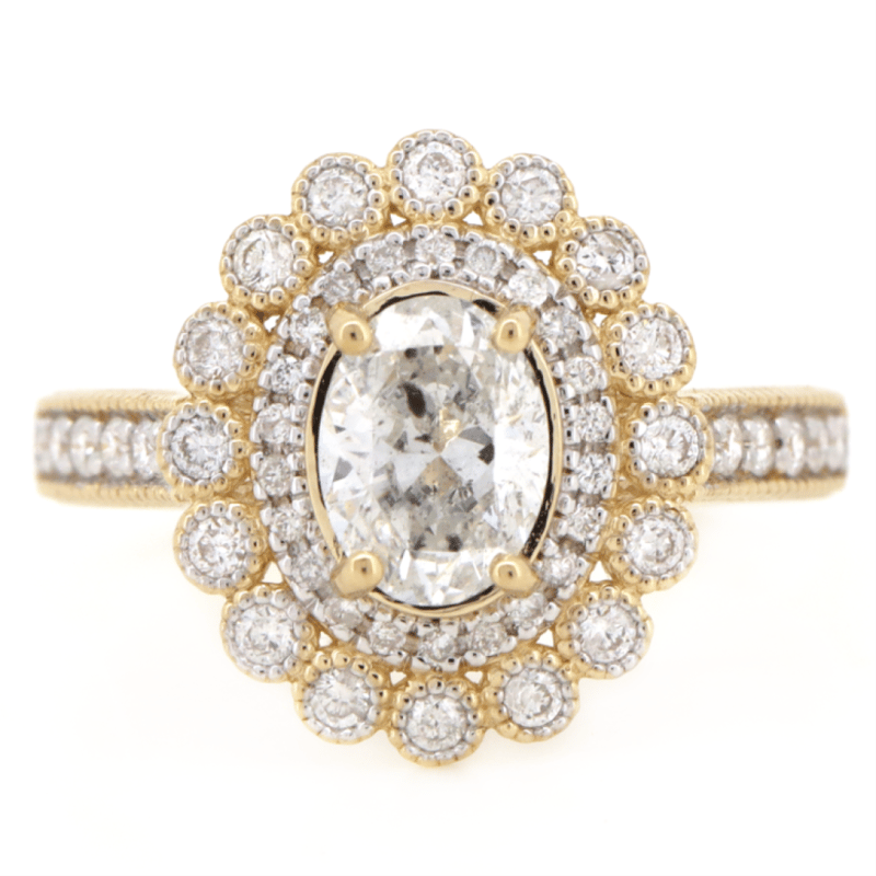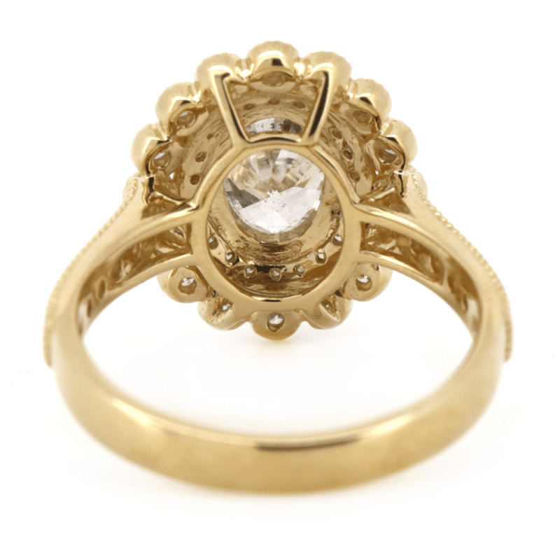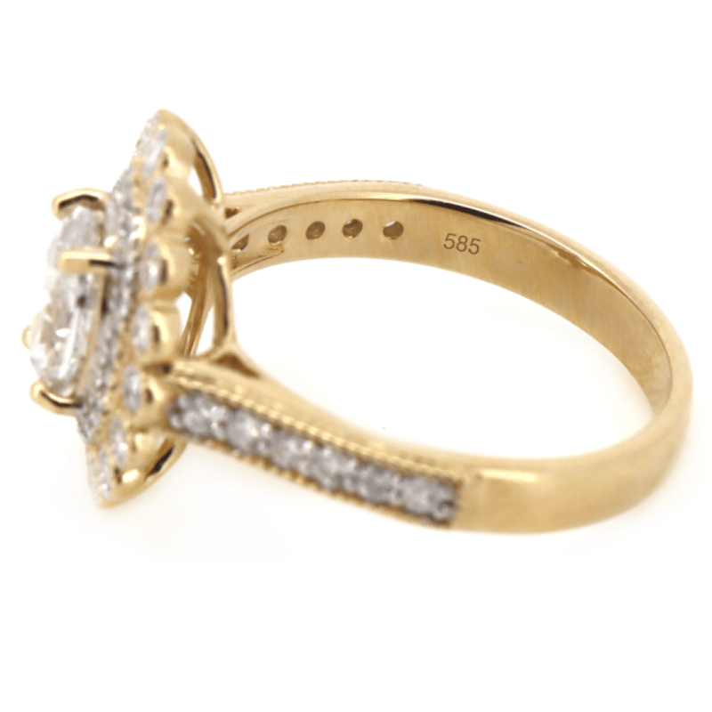 14K Yellow Gold And Diamond, Double Halo Ring. The Centre Features, Cut Diamond (1.01Ct, J Colour, I1 Clarity), 4 Claw Set. Surrounding The Centre In A Double Halo And Decorating The Band Are, 50 Round Brilliant Cut, Diamonds (0.46Ct Tdw, H Colour, Si-I1 Clarity), Bezel/Bead Set With Millegrain Detail. Ring Size M.