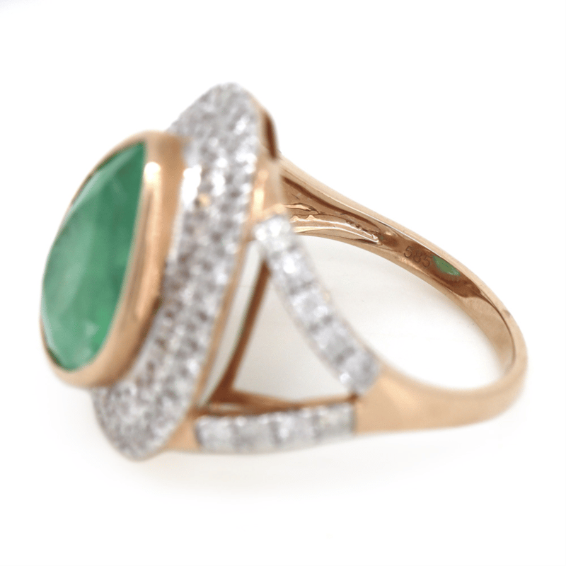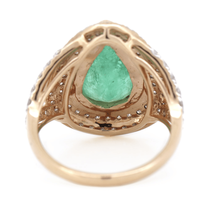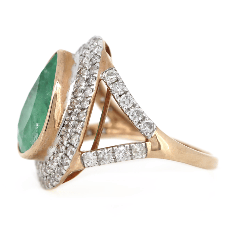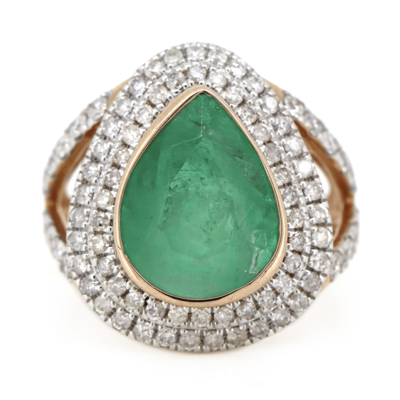 14K Rose Gold, 4.35Ct Colombian Emerald And Diamond, Double Halo Split Band Ring. The Centre Features, One Pear Cut, Moderate Deep Green, Colombian Emerald (4.35Ct, Heavily Included, Enhanced), Double Bezel Set. Surrounding The Centre In Double Halo And Decorating The Band, 83 Round Brilliant Cut, Diamonds (1.09Ct Tdw, I-J Colour, P1+ Clarity), Micro-Bead Set In White Gold. Ring Size N.