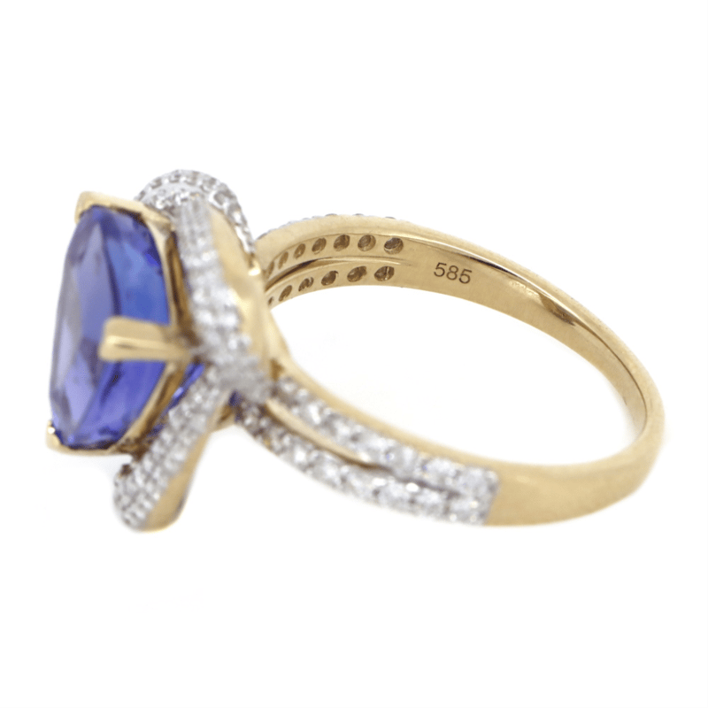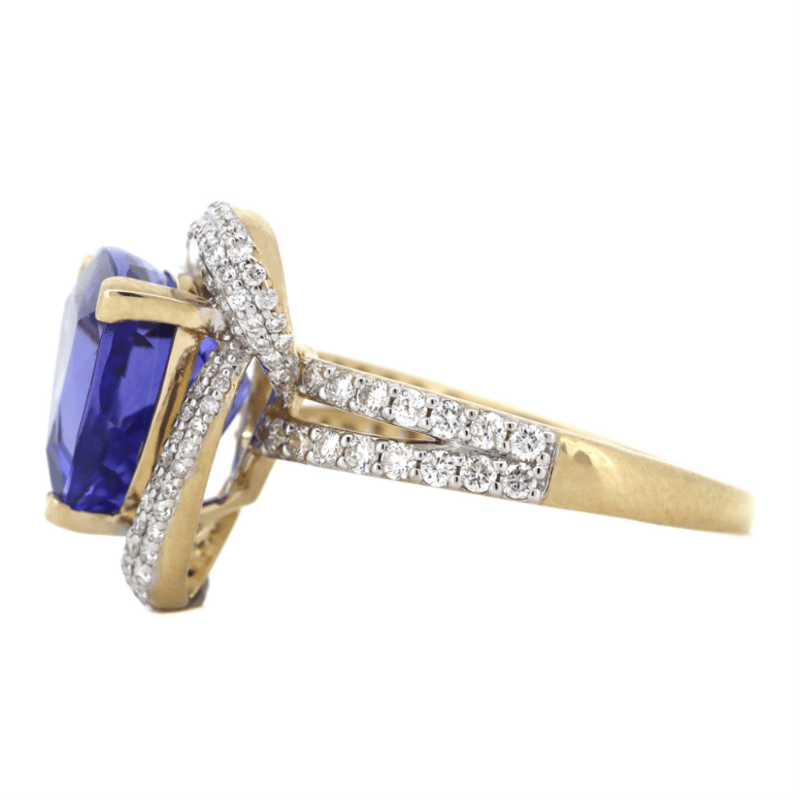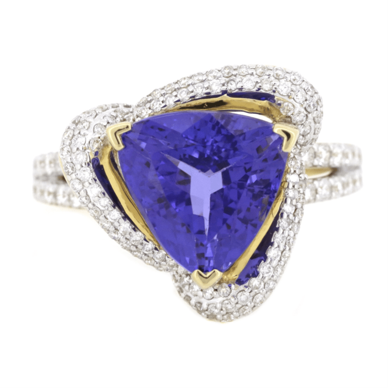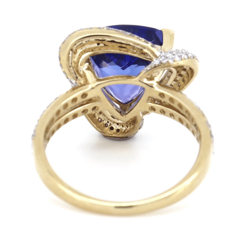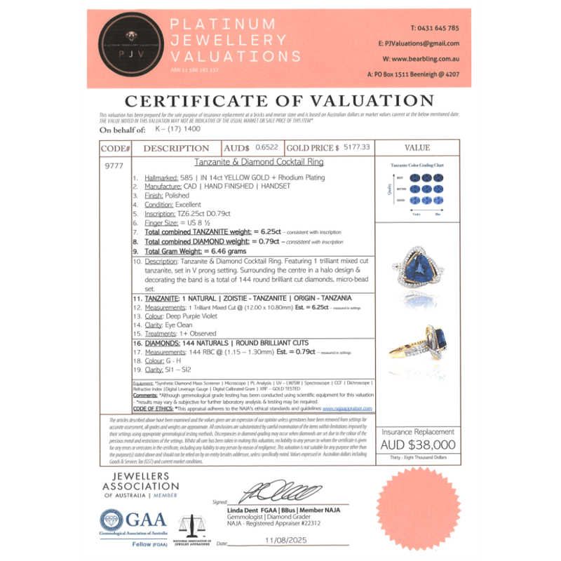 14K YELLOW GOLD, 6.25CT TANZANITE AND DIAMOND, COCKTAIL RING. The Centre Features, One Trilliant Cut, Deep Purple Violet, Tanzanite (6.25Ct, Eye Clean Clarity, Enhanced), Claw Set In Yellow Gold. Surrounding The Centre And Decorating The Band Are, 144 Round Brilliant Cut, Diamonds (0.79Ct Tdw, G-H Colour, Si1-Si2 Clarity), Bead/Pave Set In White Gold. Ring Size Q 1/2. 14K Yellow Gold, 6.25Ct Tanzanite And Diamond, Cocktail Ring. The Centre Features, One Trilliant Cut, Deep Purple Violet, Tanzanite (6.25Ct, Eye Clean Clarity, Enhanced), Claw Set In Yellow Gold. Surrounding The Centre And Decorating The Band Are, 144 Round Brilliant Cut, Diamonds (0.79Ct Tdw, G-H Colour, Si1-Si2 Clarity), Bead/Pave Set In White Gold. Ring Size Q 1/2. Jewellery Valuations Provided By A Third Party Professional Not Directly Associated With Lloyds Auctions at AUD $38,000.00This Insurance Valuation has been provided by a registered Jewellery Valuer and is intended for insurance purposes only. The valuation amount has no bearing on the auction value of the item. Any questions regarding the valuation should be directed to the issuing Valuer (refer to contact details on the certificate) as Lloyds have no association or relationship with the Valuer or the valuation amount contained within the valuation. Condition: NEW 0645883+5036