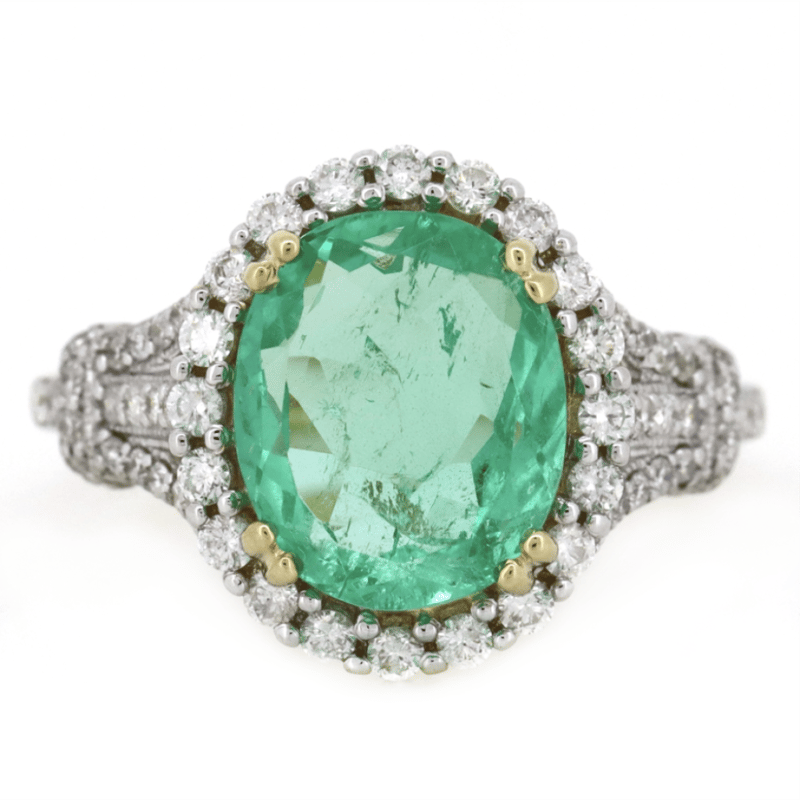 14K YELLOW GOLD, 3.21CT COLOMBIAN EMERALD AND DIAMOND, RING. The Centre Features, One Oval Cut, Moderate Vivid Green, Colombian Emerald (3.21Ct, Moderately-Heavily Included) Double 4 Claw Set. Surrounding The Centre In A Halo And Decorating The Band Are, 64 Round Brilliant Cut, Diamonds (0.72Ct Tdw, G-H Colour, P1-P2 Clarity), Bead Set In White Gold. Ring Size O 1/2. 14K Yellow Gold, 3.21Ct Colombian Emerald And Diamond, Ring. The Centre Features, One Oval Cut, Moderate Vivid Green, Colombian Emerald (3.21Ct, Moderately-Heavily Included) Double 4 Claw Set. Surrounding The Centre In A Halo And Decorating The Band Are, 64 Round Brilliant Cut, Diamonds (0.72Ct Tdw, G-H Colour, P1-P2 Clarity), Bead Set In White Gold. Ring Size O 1/2. Jewellery Valuations Provided By A Third Party Professional Not Directly Associated With Lloyds Auctions at AUD $25,000.00This Insurance Valuation has been provided by a registered Jewellery Valuer and is intended for insurance purposes only. The valuation amount has no bearing on the auction value of the item. Any questions regarding the valuation should be directed to the issuing Valuer (refer to contact details on the certificate) as Lloyds have no association or relationship with the Valuer or the valuation amount contained within the valuation. Condition: NEW 0645883+5081