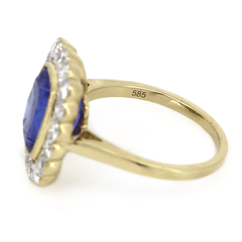 14K YELLOW GOLD, TANZANITE AND DIAMOND, HALO RING.