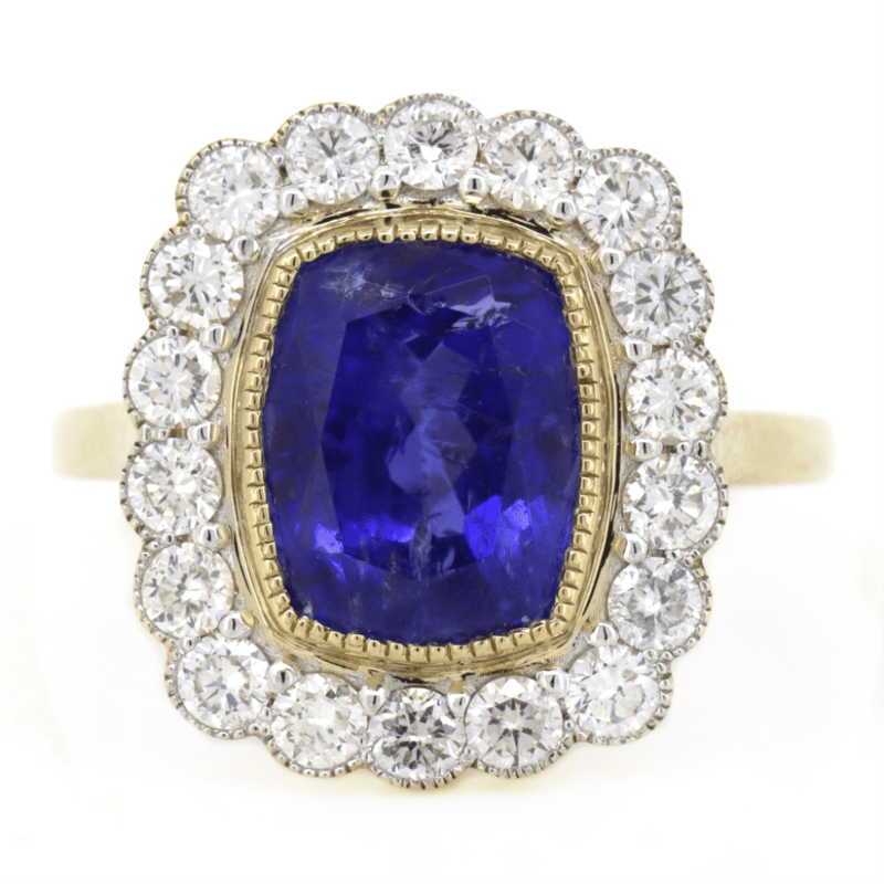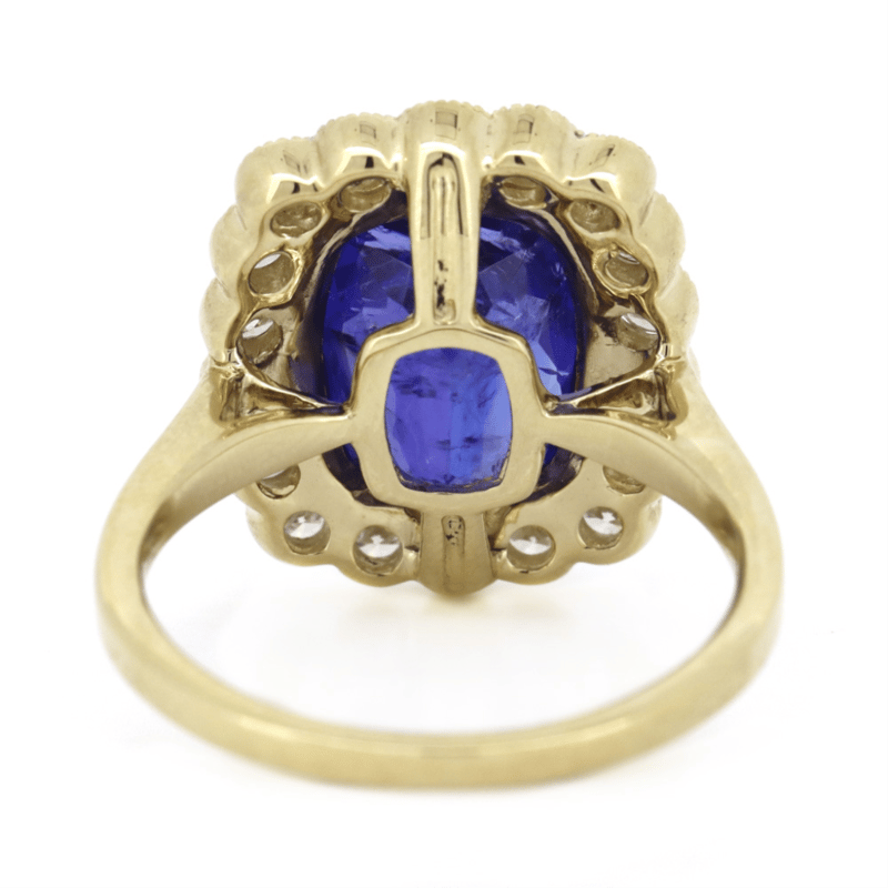 14K Yellow Gold, Tanzanite And Diamond, Halo Ring. The Centre Features, One Rectangular Cushion Cut, Vivid Violet Blue, Tanzanite (4.93Ct, Moderate-Heavy Surface Reaching Inclusions), Bezel Set. Surrounding The Centre In A Scalloped Halo Are, 18 Round Brilliant Cut, Diamonds (1.06Ct Tdw, H-J Colour, Si-I2 Clarity), Semi-Bezel/Bead Set With Millegrain Detail. Ring Size O.