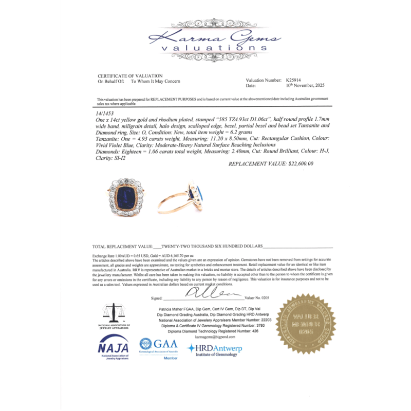 This Insurance Valuation has been provided by a registered Jewellery Valuer and is intended for insurance purposes only. The valuation amount has no bearing on the auction value of the item. Any questions regarding the valuation should be directed to the issuing Valuer (refer to contact details on the certificate) as Lloyds have no association or relationship with the Valuer or the valuation amount contained within the valuation.